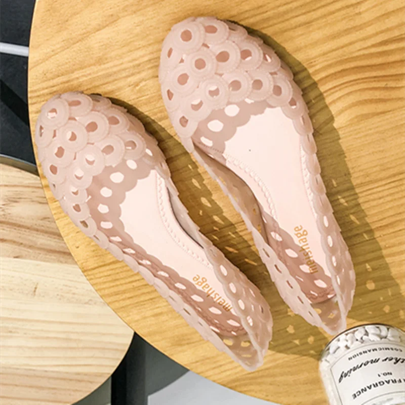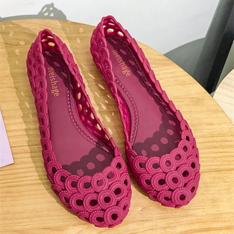 Womens PVC Jelly Shoes, Hollow Breathable Flats, Pinkish Red Ballet Shoes, Round Toe Casual Flats, Waterproof Jelly Shoes, Outdoor Casual Shoes Women, Lightweight PVC Flats, Summer Jelly Shoes, Comfortable Daily Wear Shoes, Fashion Jelly Ballet Flats