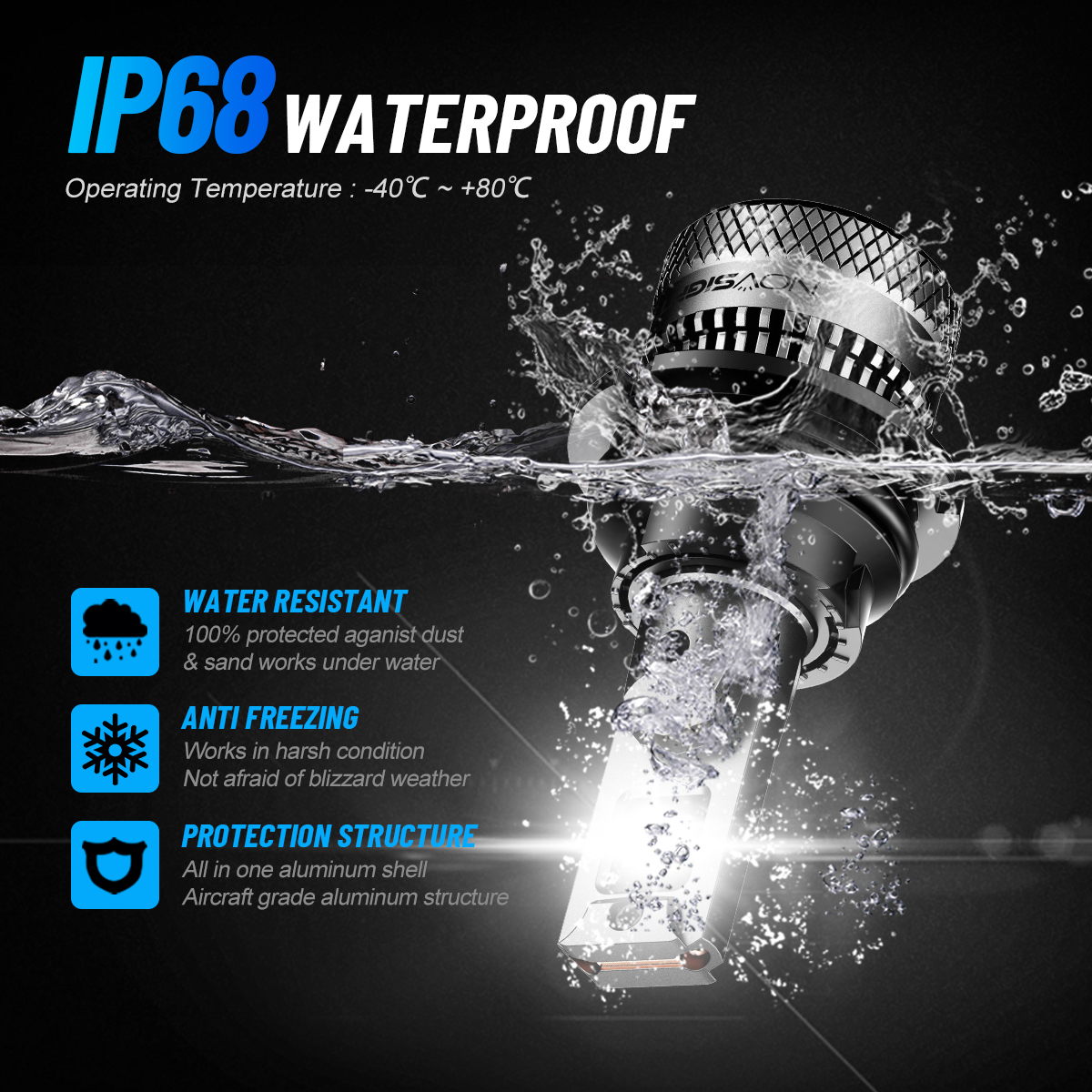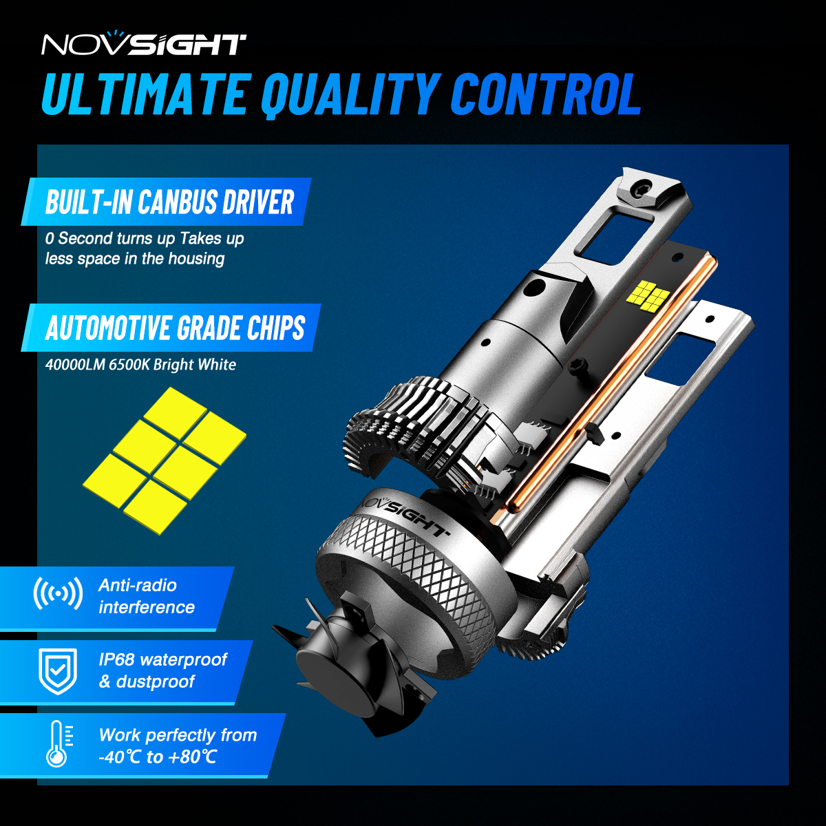 【Durable & Waterproof for All Weather Conditions】The NOVSIGHT Bulb is made from high quality materials and designed to cope with a wide range of harsh weather conditions. With an IP68 waterproof rating, they maintain excellent performance in rain, snow or extreme temperatures. Whether you're driving in rain or snow, these LED headlight bulbs ensure consistent performance and long-lasting durability.
