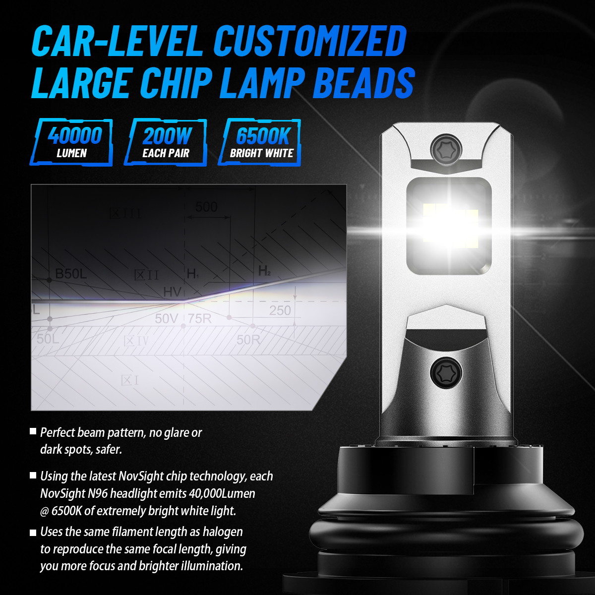 【Ultra Bright 40,000LM with 200W Power】The NOVSIGHT LED Headlight Bulb offers up to 40,000 lumens and a powerful 200W. Designed for drivers who need maximum visibility, this high performance Headlight Bulb ensures you can see clearly in the darkest conditions. The perfect beam tangent ensures no black spots, providing a wider, clearer range of illumination to enhance your driving safety.