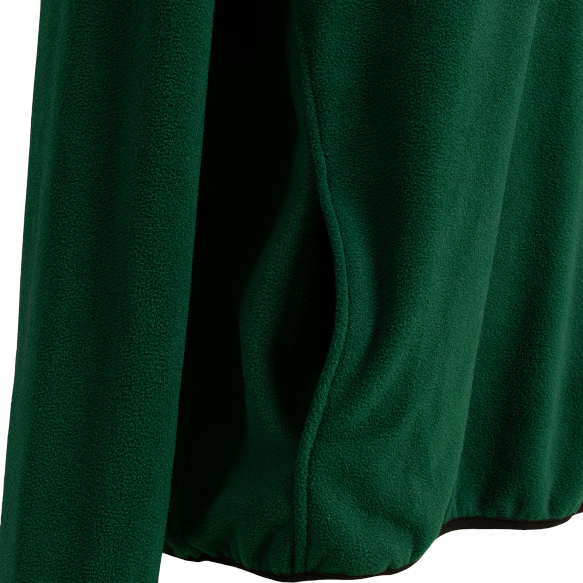 - A casual men's quarter zip fleece pullover in hunter green with black accents.