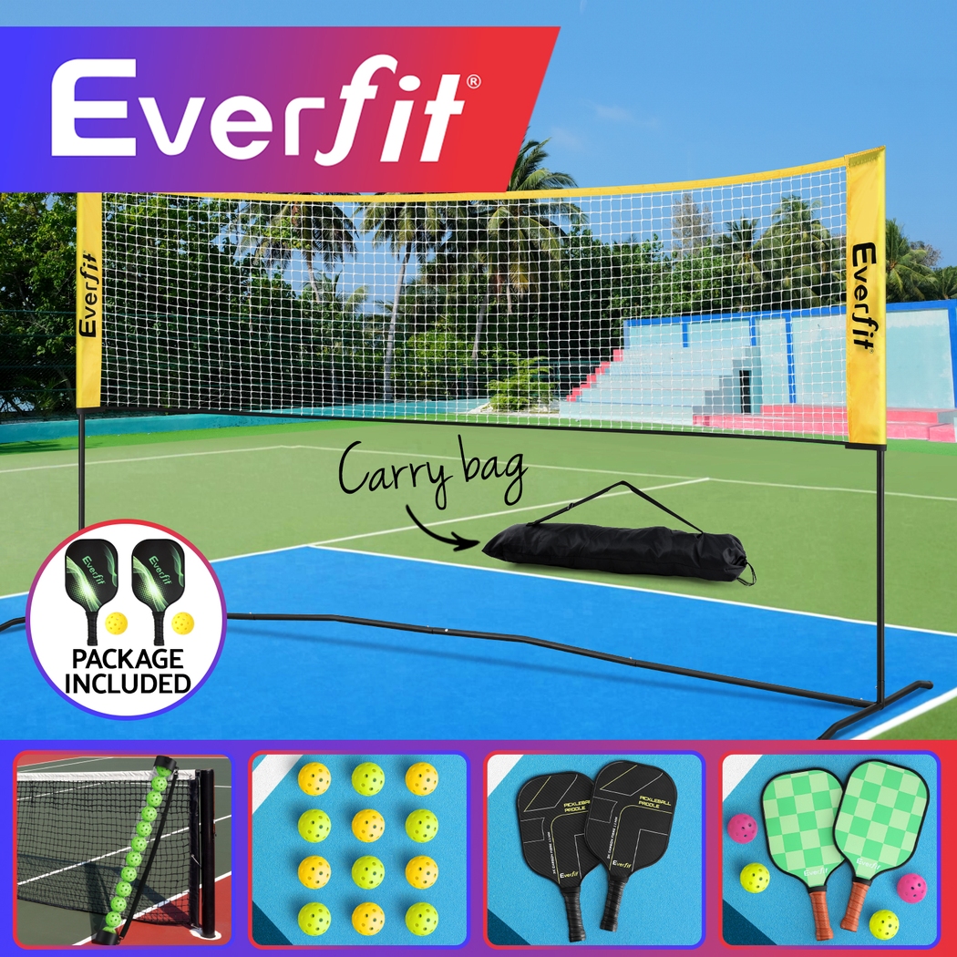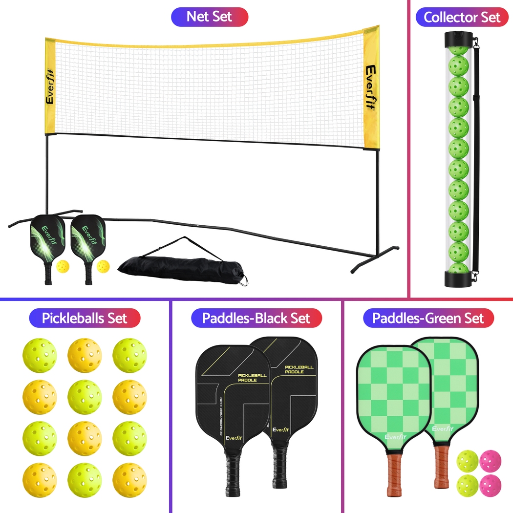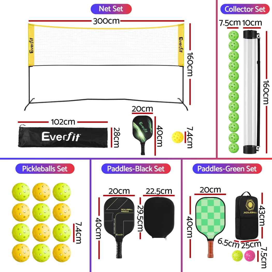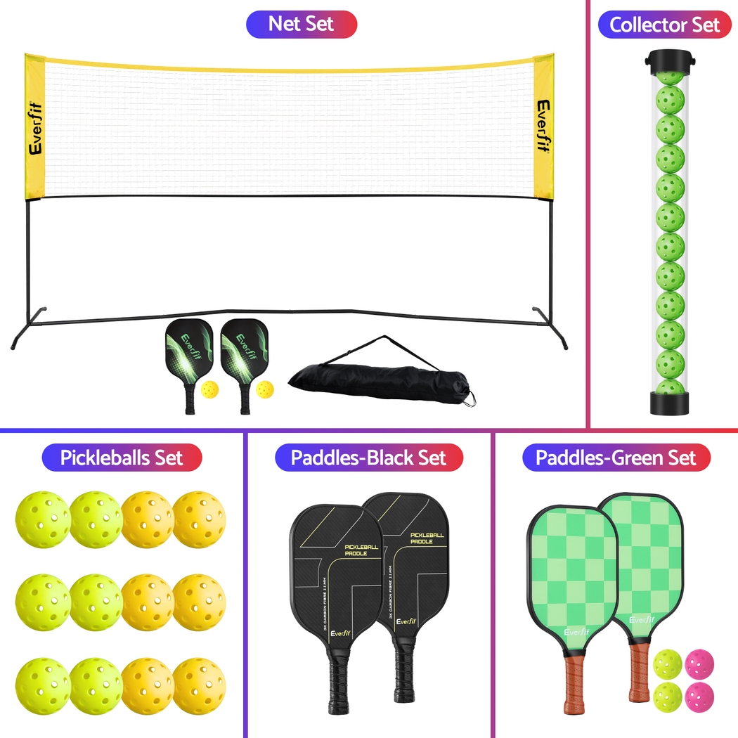The Everfit pickleball set includes everything you need to enjoy the game—regulation-size net (3.05m), 2 premium paddles (fiberglass/carbon fiber), and 12 tournament-grade balls.