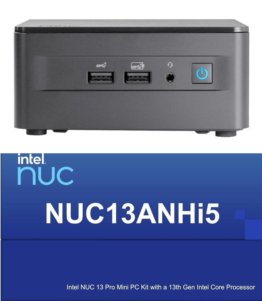 Model: Intel Form/Style: Mini PCModel No: RNUC13ANHI50001Processor: 13th Gen i5-1340P 1.90GHz Processor (upto 4.6 GHz, 12MB Cache, 12-Cores, 16-Threads, 4 Performance-cores)Memory: 16GB DDR4 SO-DIMMGraphics: Intel Iris Xe Integrated Graphics, Storage: 1TB PCIe SSD (Solid State Drive)Operating System: Windows 11 Home-64Display: Connectivity: 802.11ax Wifi, Bluetooth 5.3, RJ-45Ports/Slots:, 1 USB 2.0, 2 HDMI, 2 Thunderbolt 4, Headphone/Microphone Combo JackInput/Output:, Battery: 120W PSU, Other Features, Color: BlackWeight: 1.3lbProduct Dimensions (WxLxH): 4.5 IN x 4.65 IN x 2.25 INIntel NUC Business Mini Desktop (Intel i5-1340P, Intel Iris Xe, 16GB DDR4, 1TB PCIe SSD, 2 Thunderbolt 4, WiFi 6E, Bluetooth 5.3, 120W PSU, RJ-45, 2 HDMI, Win 11 Home)Model: Intel Form/Style: Mini PCModel No: RNUC13ANHI50001Processor: 13th Gen i5-1340P 1.90GHz Processor (upto 4.6 GHz, 12MB Cache, 12-Cores, 16-Threads, 4 Performance-cores)Memory: 16GB DDR4 SO-DIMMGraphics: Intel Iris Xe Integrated Graphics, Storage: 1TB PCIe SSD (Solid State Drive)Operating System: Windows 11 Home-64Display: Connectivity: 802.11ax Wifi, Bluetooth 5.3, RJ-45Ports/Slots:, 1 USB 2.0, 2 HDMI, 2 Thunderbolt 4, Headphone/Microphone Combo JackInput/Output:, Battery: 120W PSU, Other Features, Color: BlackWeight: 1.3lbProduct Dimensions (WxLxH): 4.5 IN x 4.65 IN x 2.25 IN