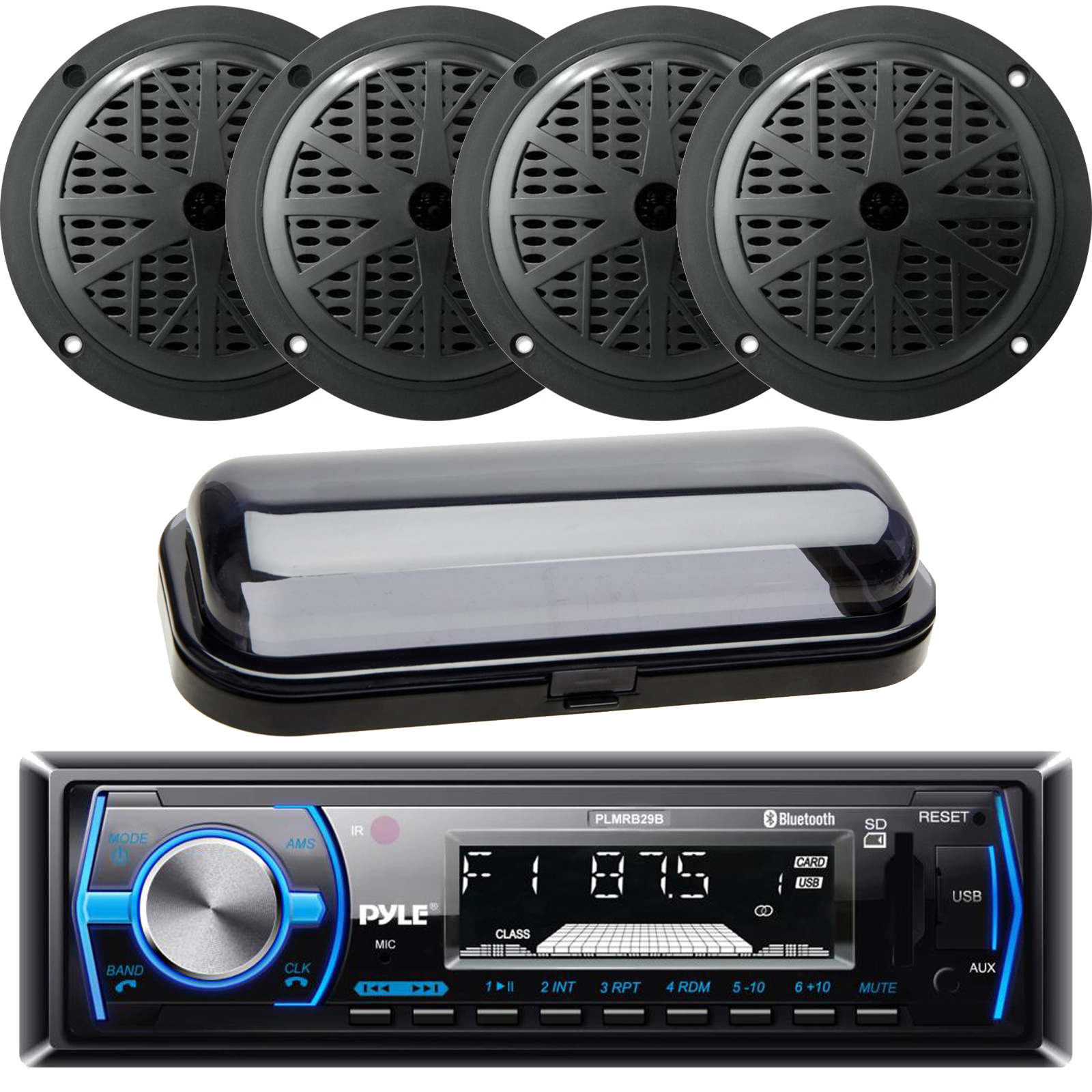 Pyle PLMRB29B Bluetooth In-Dash Stereo Radio USB AUX Headunit Receiver with 4x 5.25" Black Round Speakers, Radio Cover