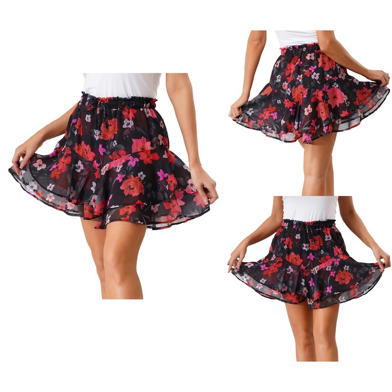 The tiered ruffled hem and flared culottes style bring a sense of playfulness and movement, making the skirt more dynamic and stylish.