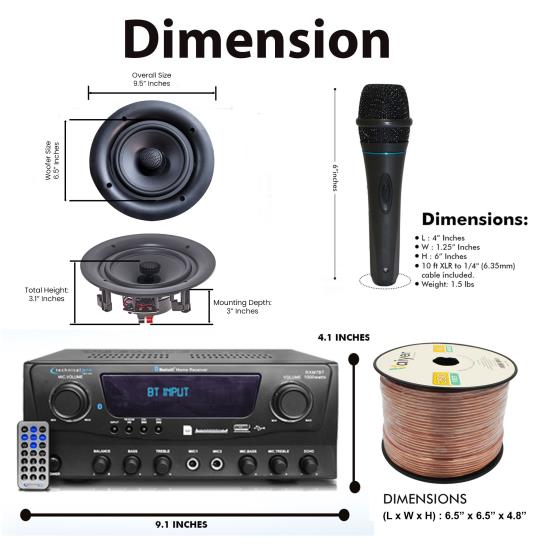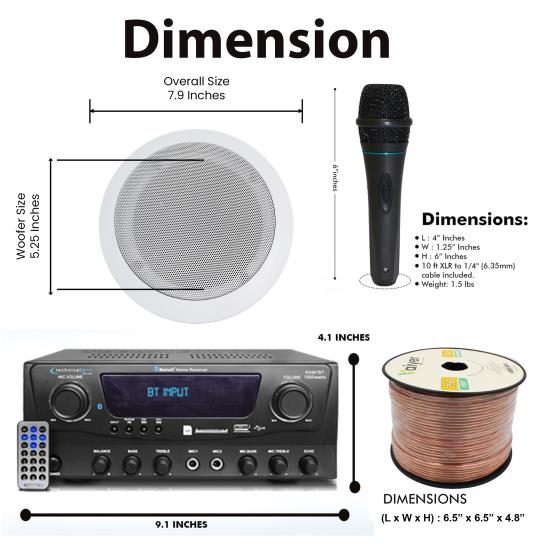 Technical Pro 1000 Watts Professional Bluetooth Receiver with USB & SD Card Inputs | Portable Microphone with Digital Processing | (Qty 6) 5.25” Ceiling Wall Mount Frame-less Speakers - 2-Way Mid bass Woofer Speaker | 16 Gauge 250 ft. Spool of High Qualit