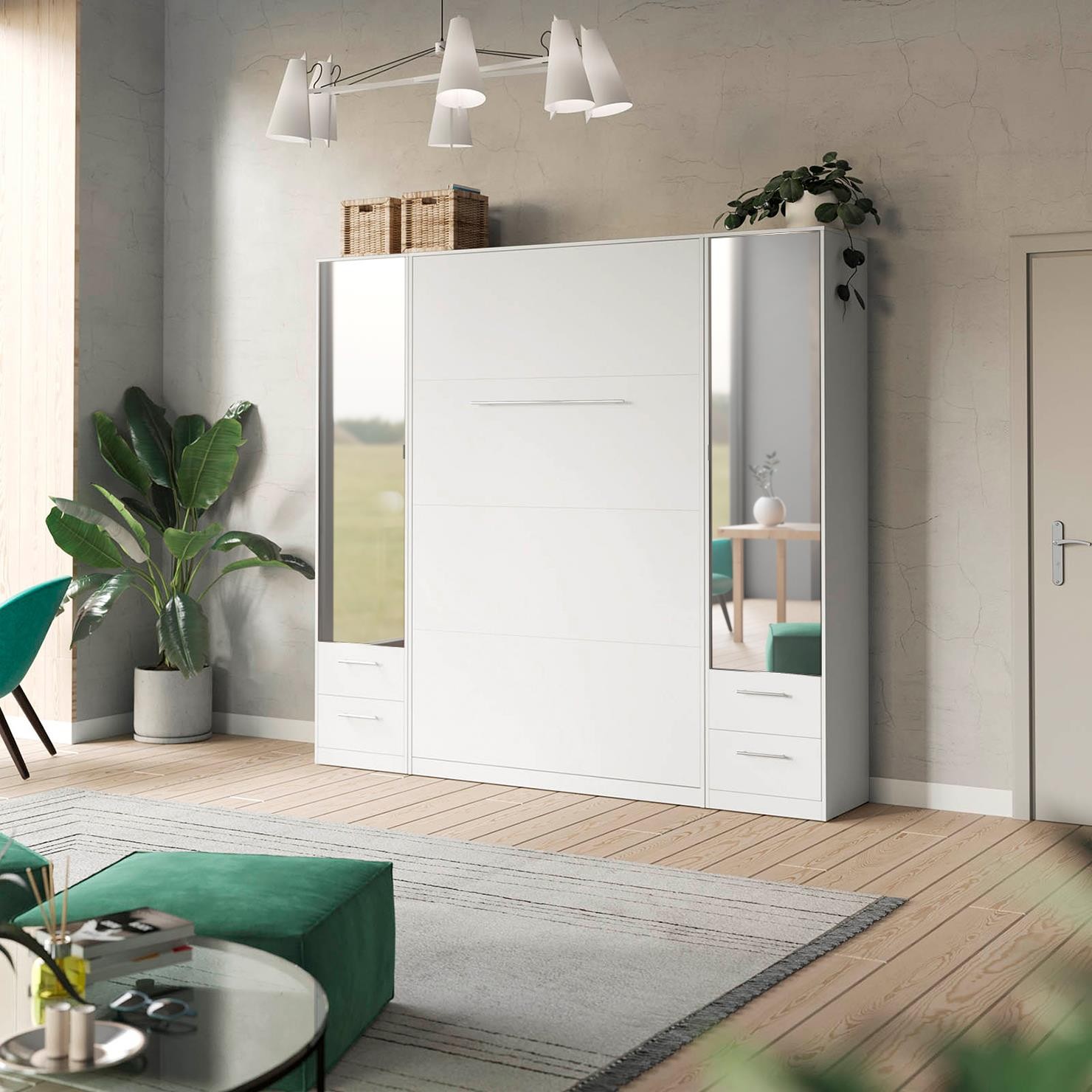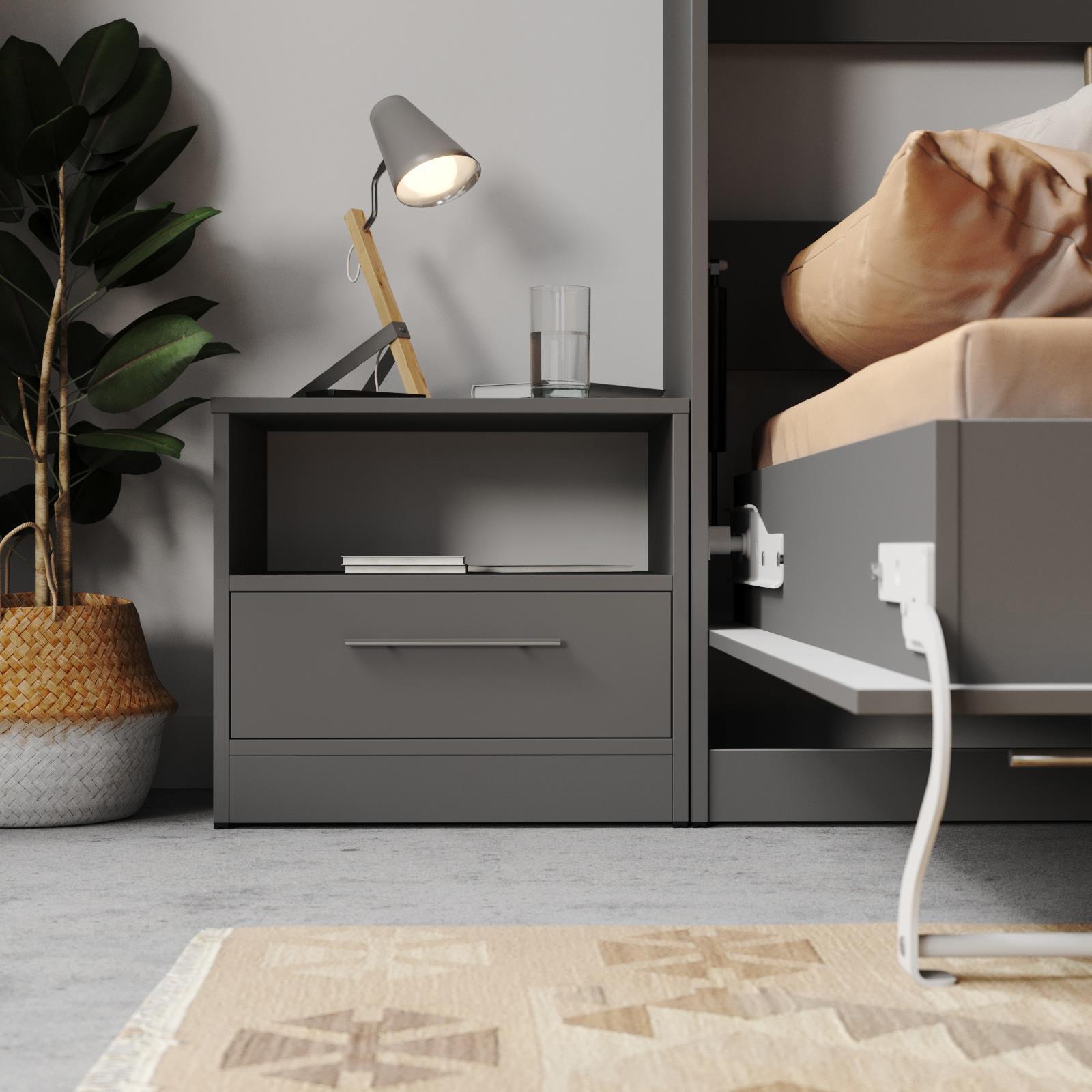 ELEMENTOS DE ESTANTE La cama abatible está equipada con dos elementos de estante integrados y una repisa que ofrecen espacio de almacenamiento adicional para libros, decoraciones o artículos personales como despertadores, teléfonos móviles o fotos de sus seres queridos. Estos estantes aumentan tanto la funcionalidad como la estética del mueble.