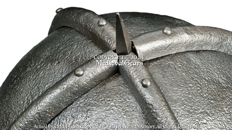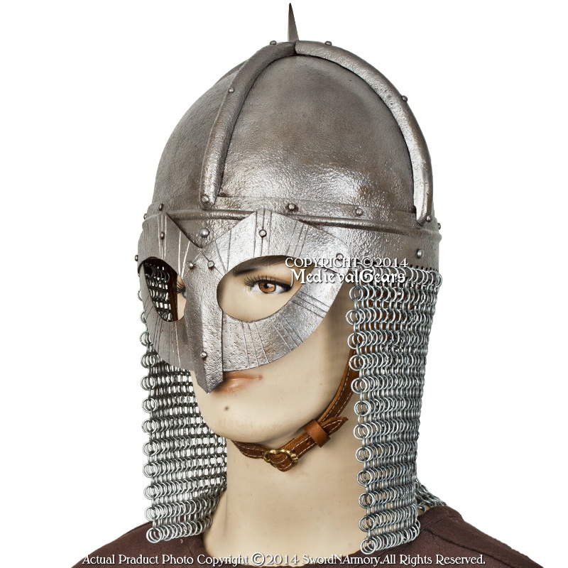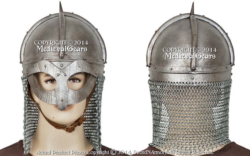 This helmet features a rounded crown that has been reinforced with horizontal and transverse metal strips, as well as several rivets that secure the reinforcements in place. A pointed spike is impressively positioned at the top of the helmet. Instead of a typical nose guard, the helmet features a face guard that covers the eyes and the nose. Attached to the rim of the helmet is also a butted chainmail, which acts as further protection for the neck, sides, and lower face.