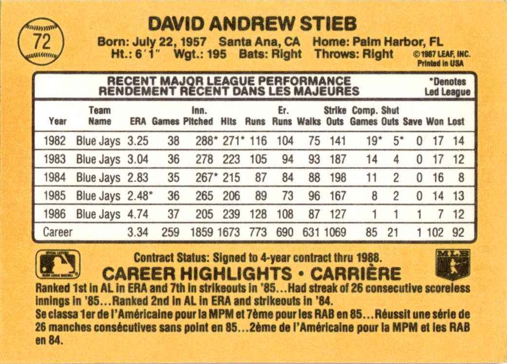 | 1987 Leaf Dave Stieb Toronto Blue Jays #72 |
