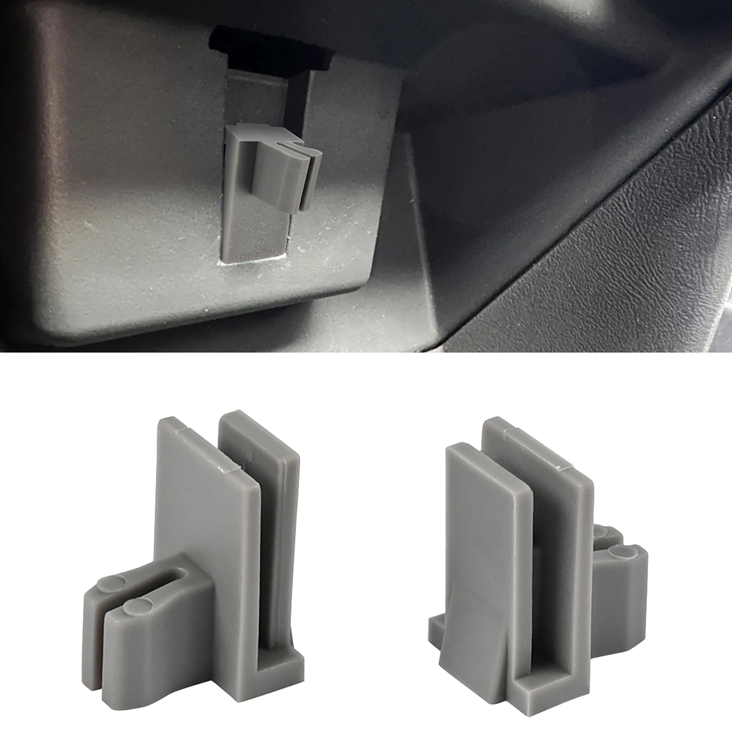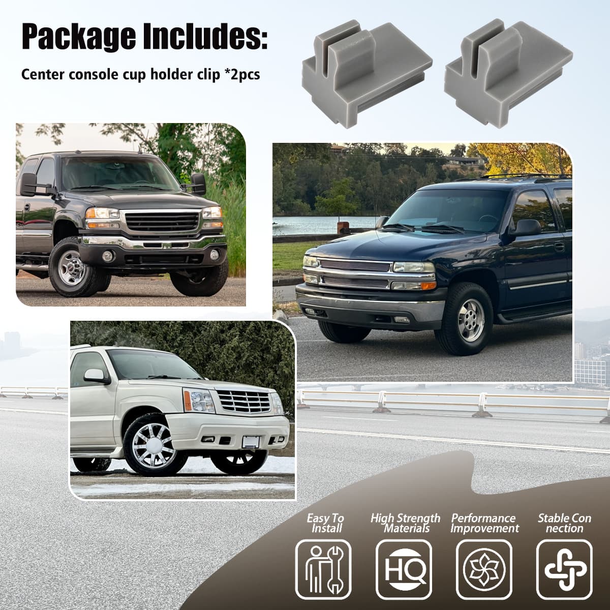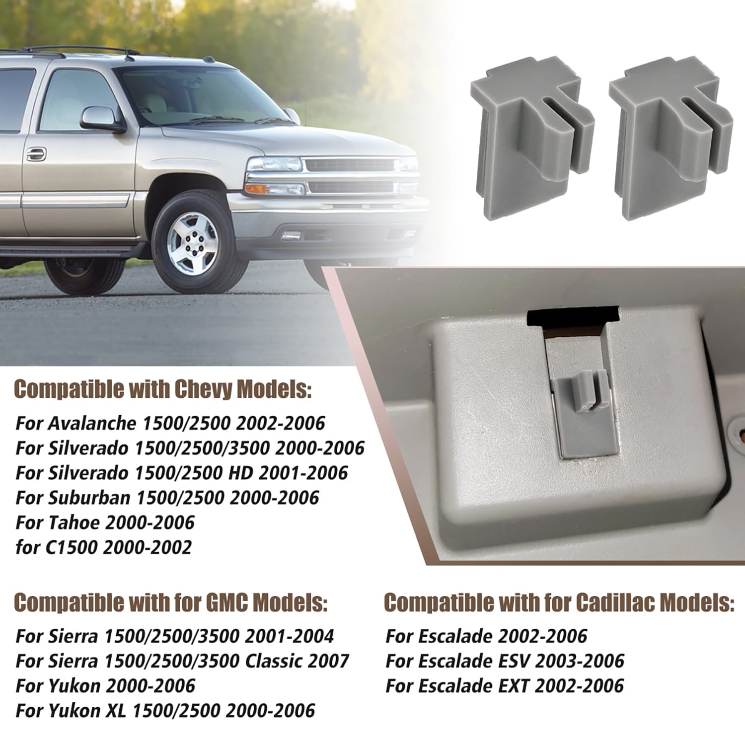 Product Description: Brand New Console Cup Holder Latch Clip OEM Part Number: 88934982 Color: Gray This replacement Console Cup Holder Latch Clip replaces your old clip that retains rear cup holder tray in the up-right position Fitment: For Avalanche 1500 2002 - 2006 For Avalanche 2500 2002 - 2006 For C1500 2000 - 2002 For Silverado 1500 2000 - 2006 Compatible with FOR Silverado 1500 Classic 2007 For Silverado 1500 HD 2001 2002 2003 2005 2006 For Silverado 1500 HD Classic 2007 For Silverado 2500 2000 - 2006 For Silverado 2500 HD 2001 - 2006 For Silverado 2500 HD Classic 2007 Compatible with for Silverado 3500 Classic 2007 For Suburban 1500 2000 - 2006 For Suburban 2500 2000 - 2006 For Tahoe 2000 - 2006 For GMC Models: For Sierra 1500 2000 - 2006 For Sierra 1500 Classic 2007 For Sierra 1500 HD 2001 2002 2003 2005 2006 For Sierra 1500 HD Classic 2007 For Sierra 2500 2000 - 2004 For Sierra 2500 HD 2001 - 2006 For Sierra 2500 HD Classic 2007 For Sierra 3500 2001 - 2006 For Sierra 3500 Classic 2007 For Yukon 2000 - 2006 For Yukon XL 1500 2000 - 2006 For Yukon XL 2500 2000 - 2006 For Cadillac Models: For Escalade 2000 2002 2003 2004 2005 2006 For Escalade ESV 2003 - 2006 For Escalade EXT 2002 - 2006 Package Included: 2PCS Cup Holder Clips before order please make sure this clip can fit your vehicle