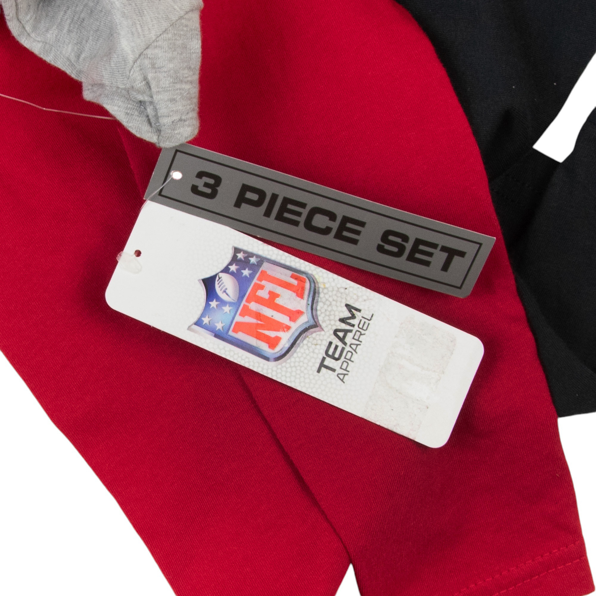 Get her ready for good times with this girls' officially licensed Atlanta Falcons 3-piece set! This quality garment will last for seasons to come! This three-piece set includes one grey short sleeved T-Shirt made of 90% cotton and 10% polyester, one long sleeved black T-shirt made of 100% cotton, and one pair of red pants made of 100% Cotton. A gentle elastic waistband on the pants provides a more comfortable fit for active little girls. This set is size 12 Months. Machine washable.