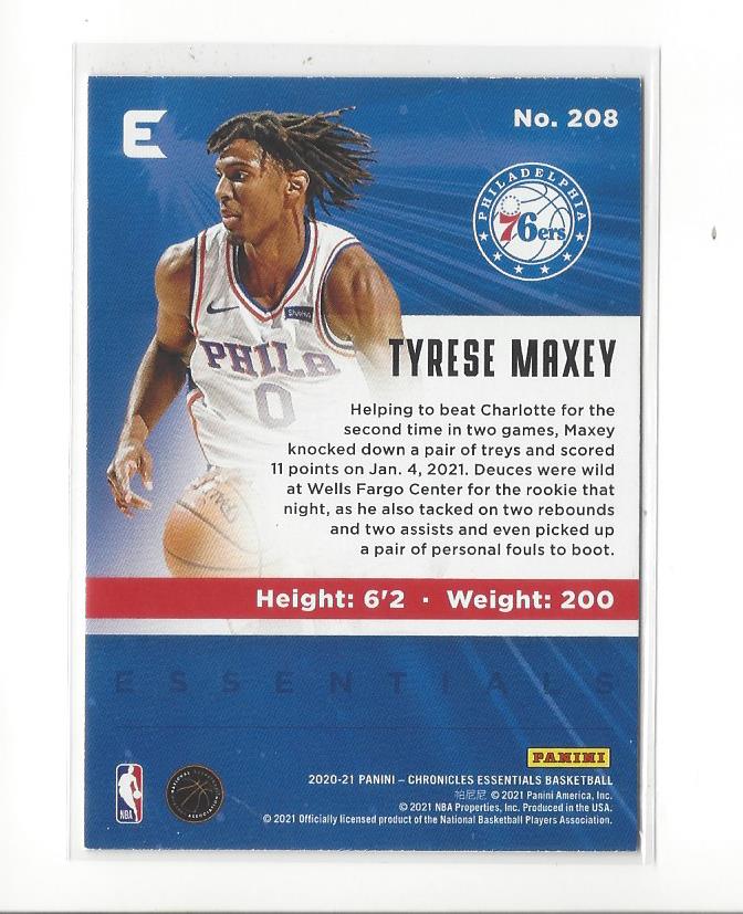 2020-21 Panini Chronicles #208 Tyrese Maxey (Essentials) RC Rookie 76ers