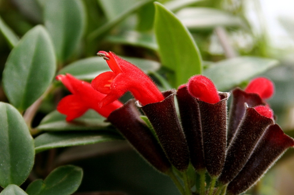 Related to African violets and gloxinias, lipstick plants are members of the gesneriad family. It's easy to see the reason for their common name since the lobed red flowers emerging from a maroon sheath do resemble lipsticks in tubes. Natives of the West Indies, the plants grow as epiphytes in the wild, but they're most comfortable in hanging baskets in the home. Blooms should come and go all year if the plant has suitable bright light and adequate water. The soil shouldn't dry out completely but should not be soggy. Like all plants from the tropics, lipstick plants suffer in low humidity. Misting the leaves will increase the humidity.