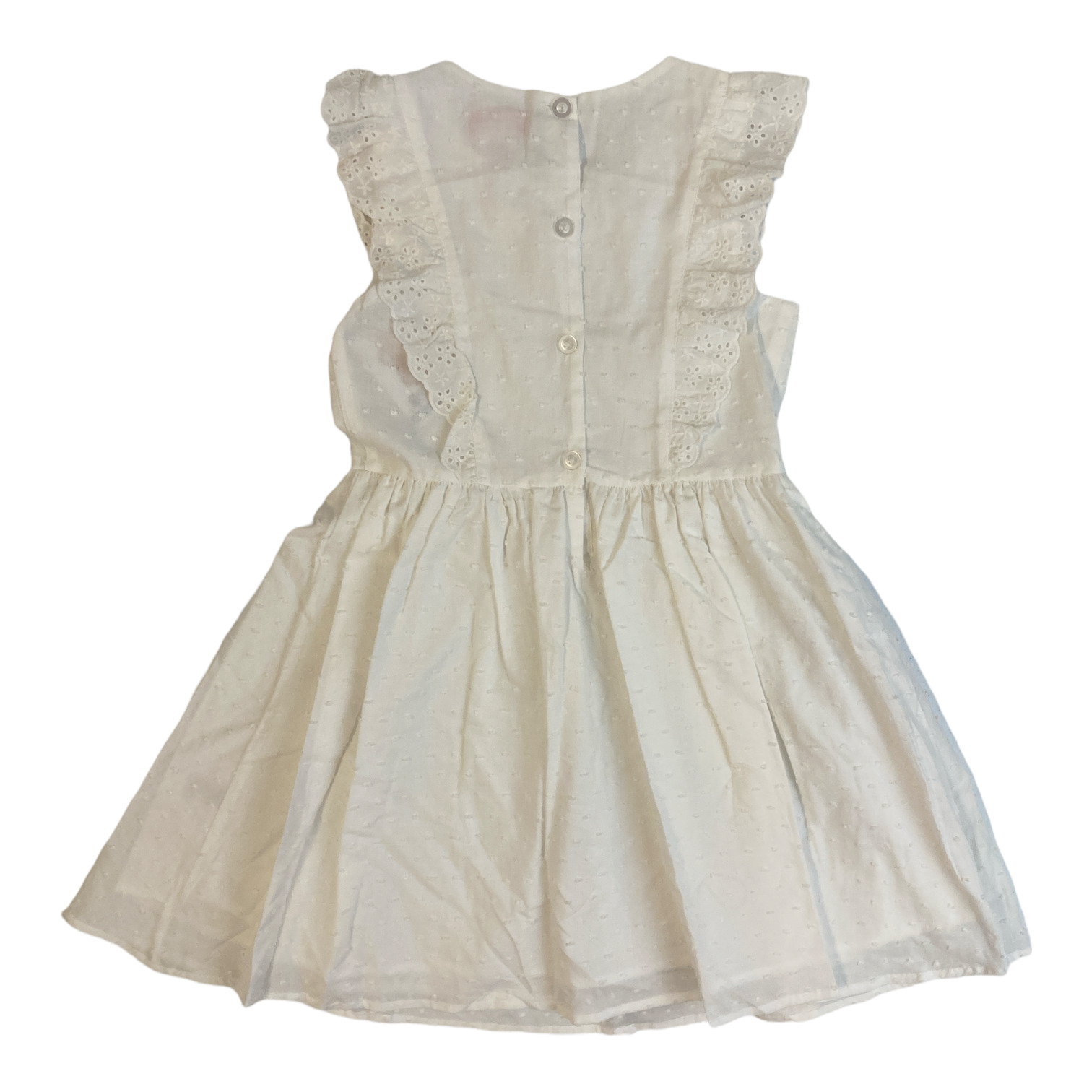 Watch her skip endlessly in this sweet textured clip dot woven cotton dress with beautiful ruffle detail on the bodice. Solid white textured clip dot woven cotton. Machine Wash. Material: 100% Cotton. This is a girl's size Medium (7/8), approximate measurements: 13.5" chest, 27" length