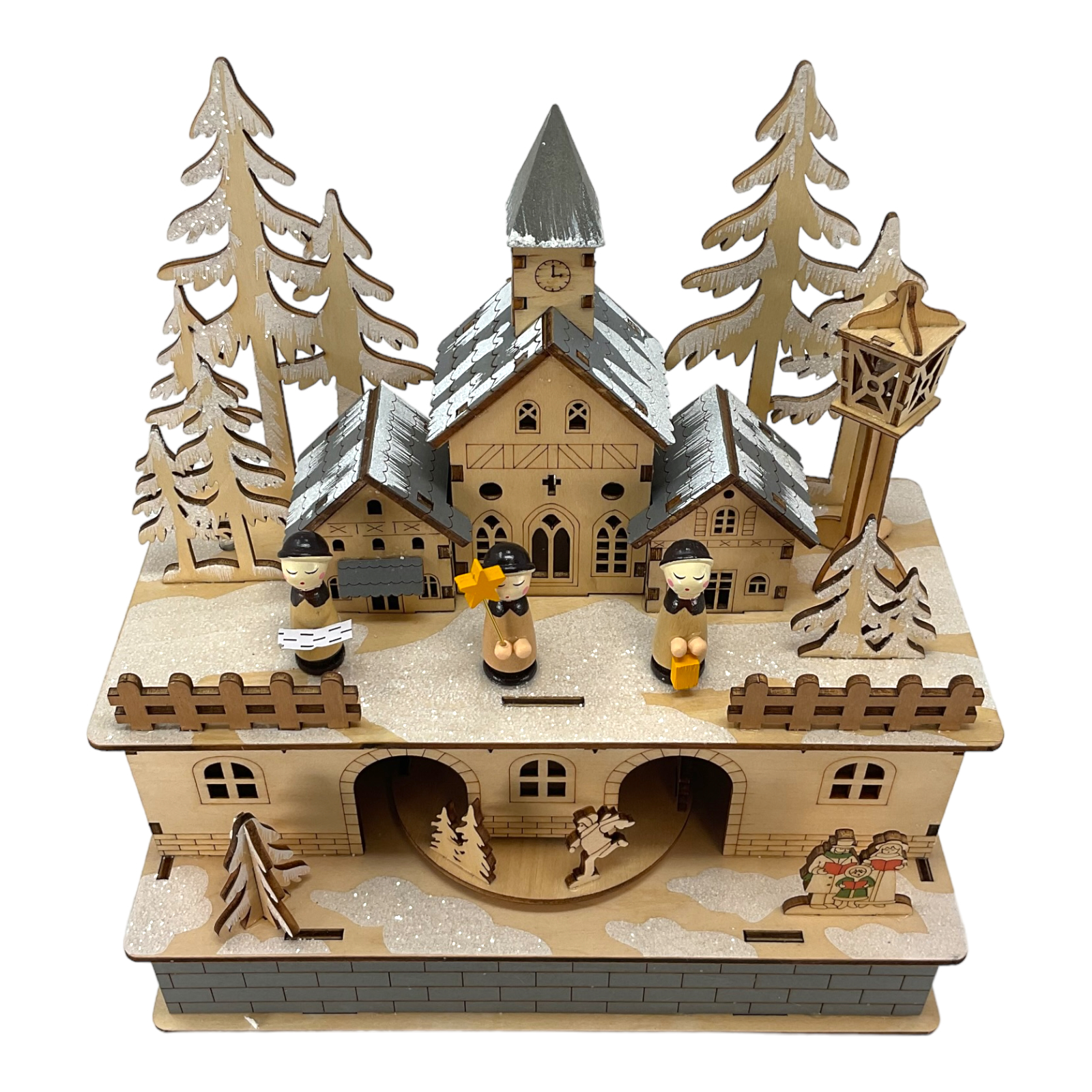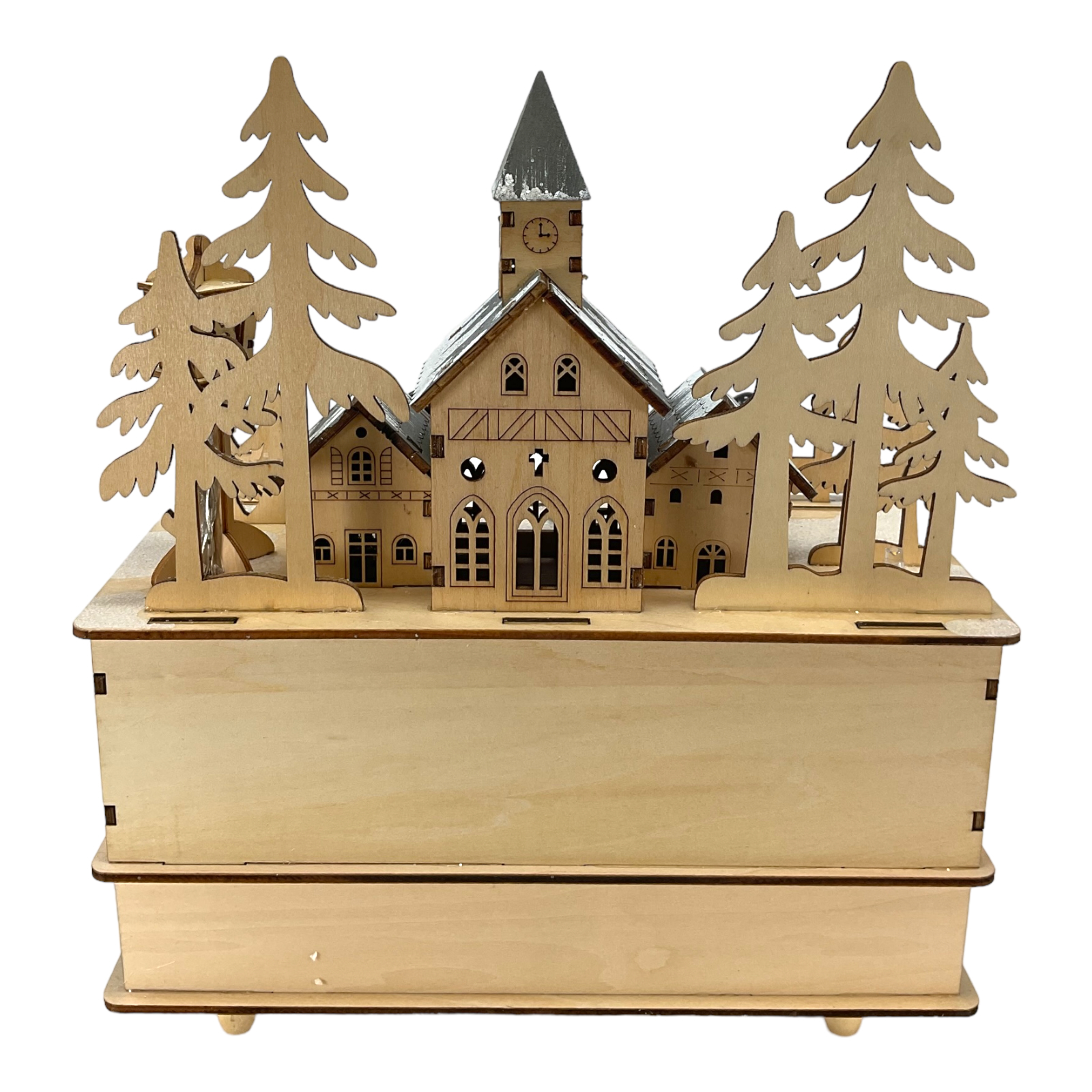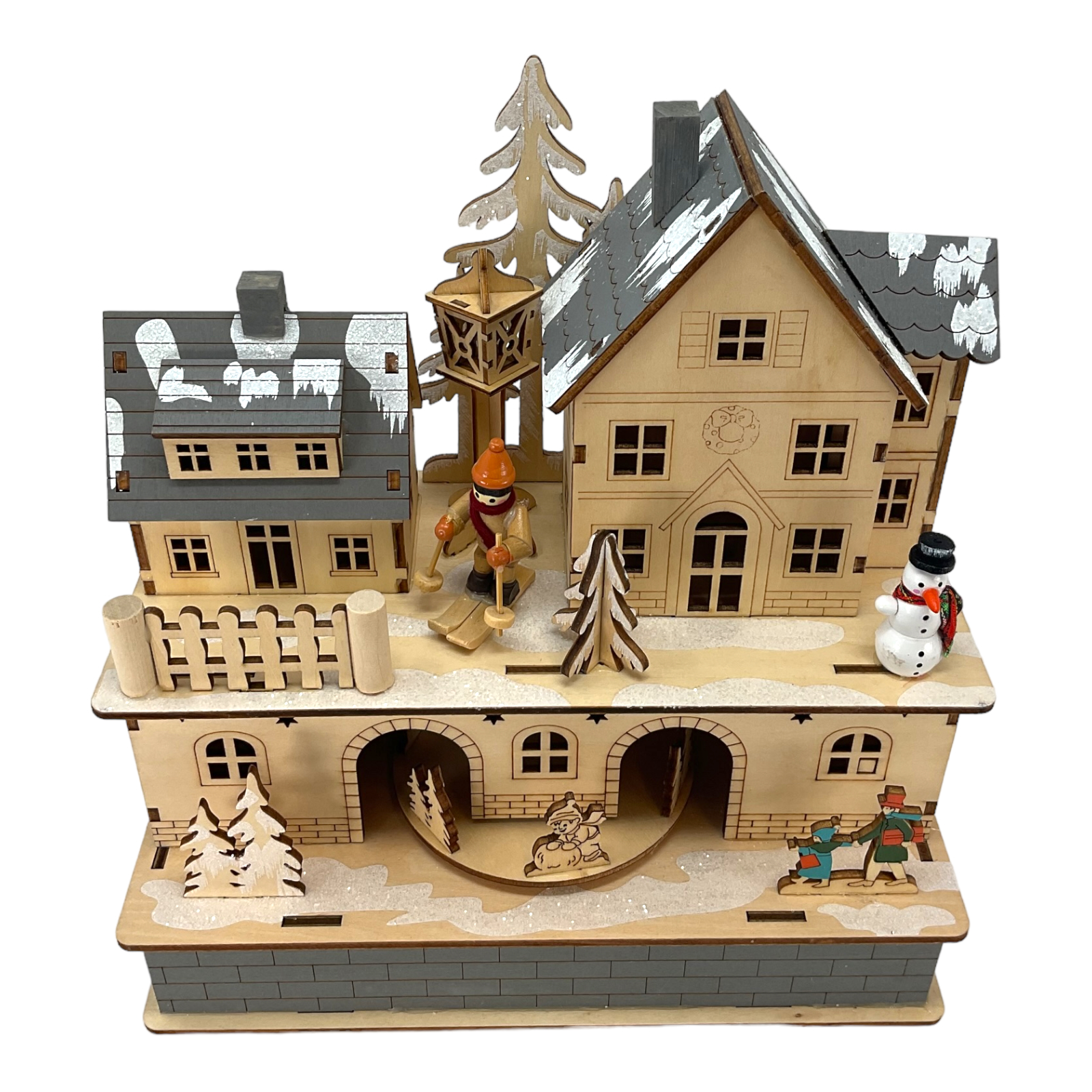 Village with Skiers and Singers Christmas Figurine. 2 piece set. Set includes 1 village with skiers and 1 village with singers. Made from wood. Battery operated. Requires 2 AA batteries NOT included. Lights up. Musical. Has a rotating scene on the bottom. Approximately 9.5 inches tall x 8.75 inches long x 4.5 inches wide.