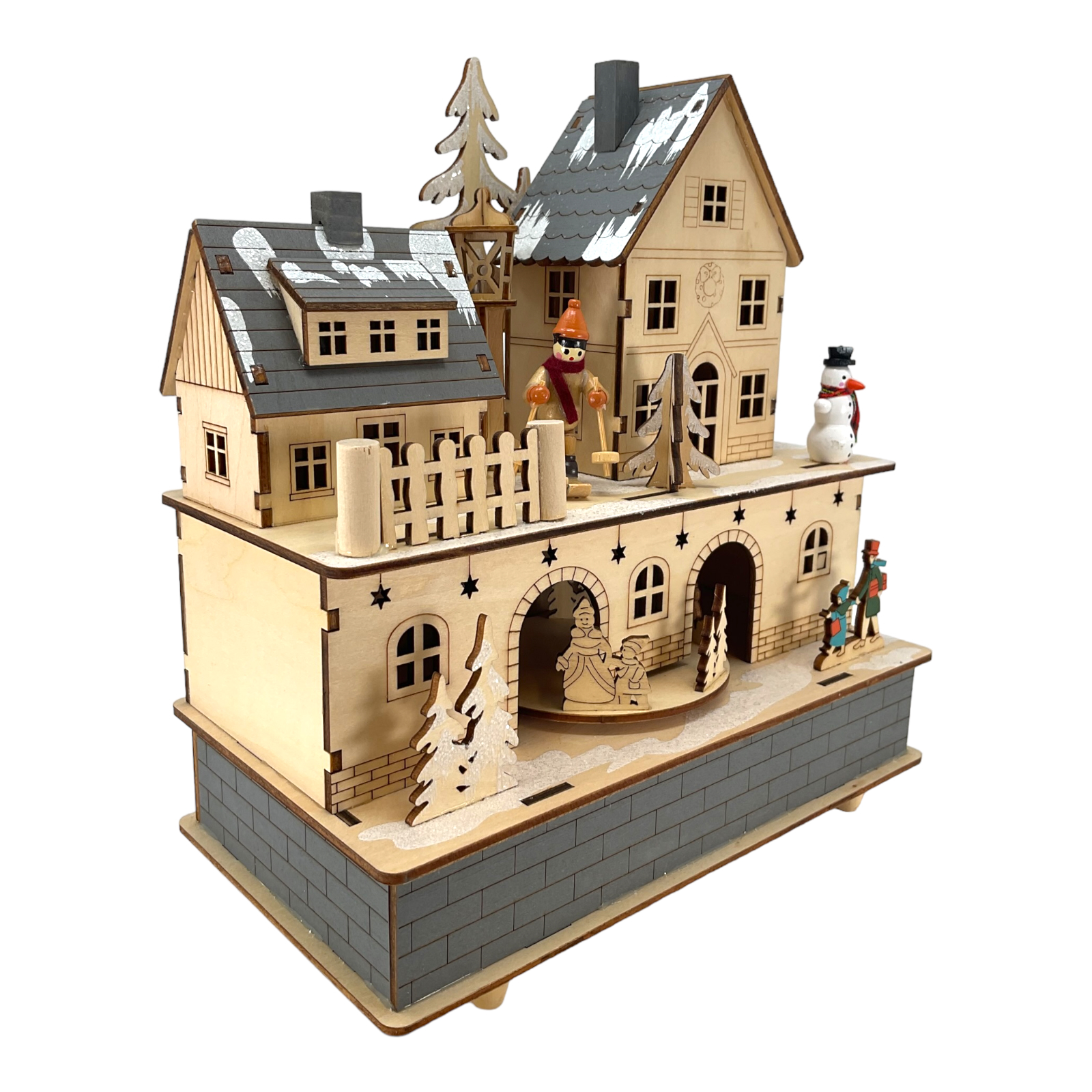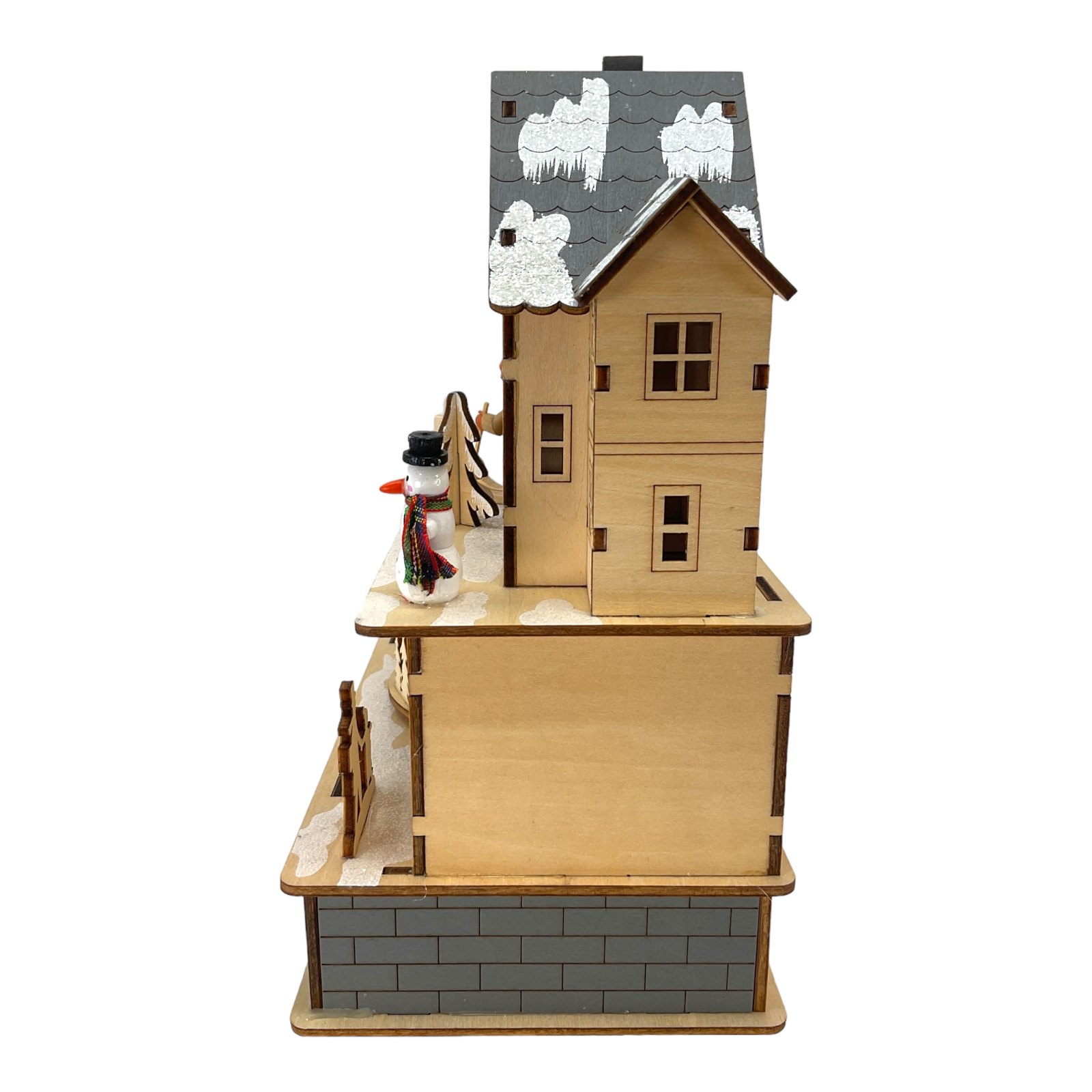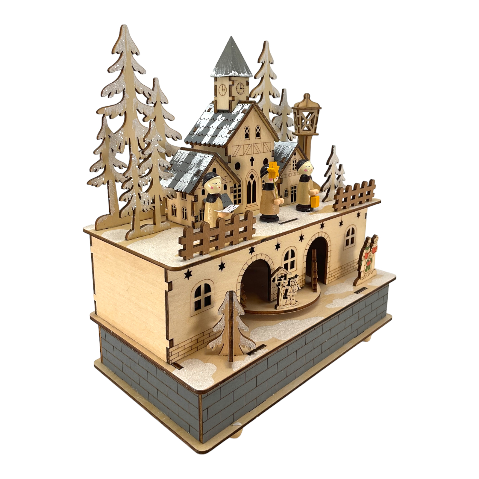 Village with Skiers and Singers Christmas Figurine. 2 piece set. Set includes 1 village with skiers and 1 village with singers. Made from wood. Battery operated. Requires 2 AA batteries NOT included. Lights up. Musical. Has a rotating scene on the bottom. Approximately 9.5 inches tall x 8.75 inches long x 4.5 inches wide.