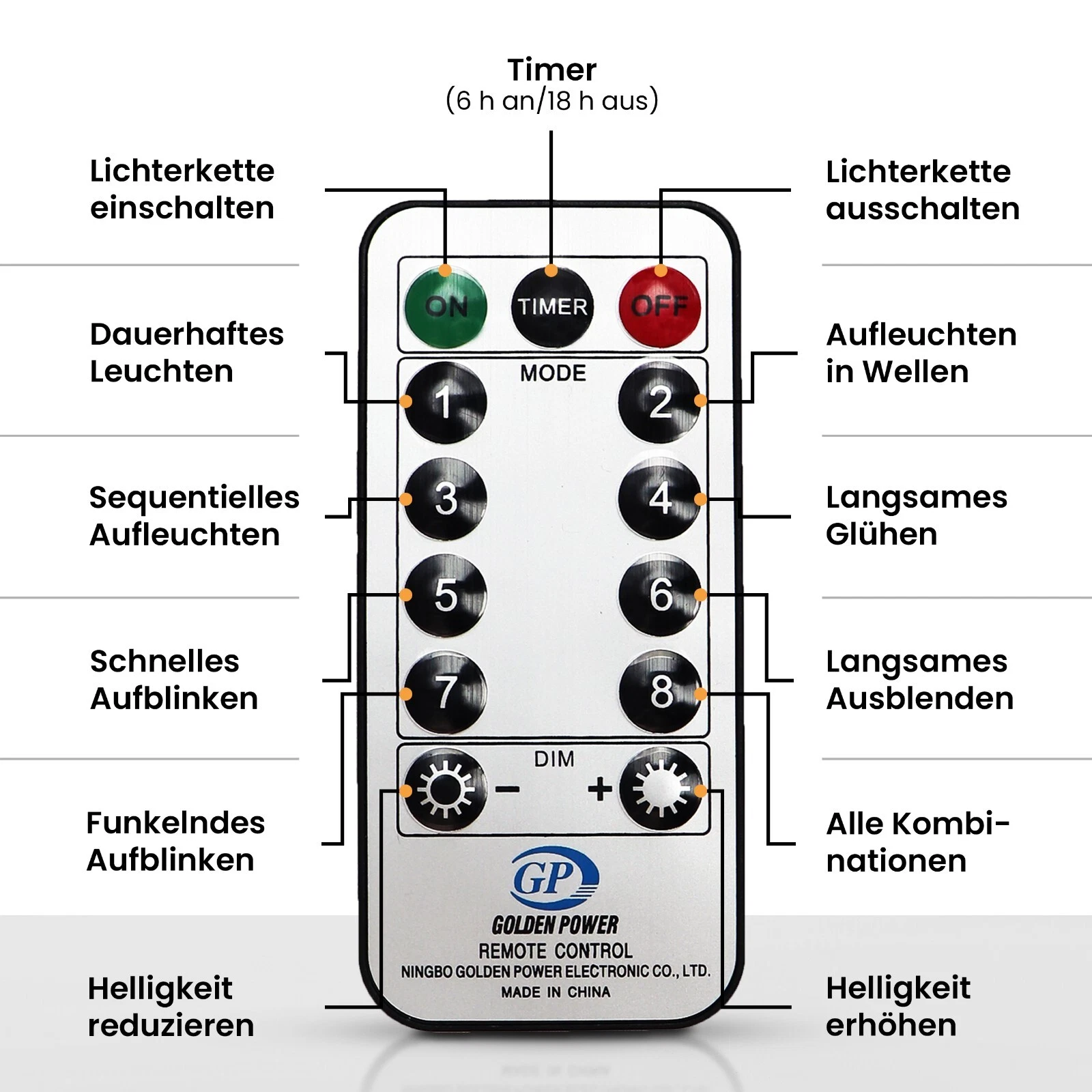 • Timerfunktion: Die Lichterkette leuchtet 6 Stunden lang und schaltet sich dann automatisch für 18 Stunden aus und startet erneut
