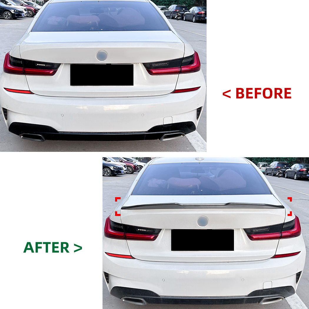 PSM-Style Duckbill Rear Spoiler For BMW 3-Series G20 2019-2024 PACKAGE INCLUDED: 1x Rear Spoiler (Tape-On Installation) FITMENT: Fits 2019-2024 BMW G20 3 Series 4 Door Sedan Fits 2021-2024 BMW G80 M3 SPECIFICATION: Material: ABS Spoiler Color: Gloss Black Fitment Type: Installed By Double-Sided Tapes. Apply Area: Rear Trunk Boot Instruction: 1.Test fitting the spoiler and mark the place where you are going to apply. 2. Cleaning the applying area with some alcohol or detergent or water or something (we don’t provide cleaning tools). 3. Hold the Spoiler on place and apply some extra tapes to help you adjust the position end-by-end. 4. Once everything is lined up, peel off the red skin on back to apply the double-sided tapes. 5. You need to press these spoiler in a few minutes to reinforce the attaching. FEATURE: Direct Fit. Easy install and durable use. Great quality and great Fitment. Correct Connector No cutting or splicing. Strict quality control standards to Build and test. It'll give you a sporty look without making it too aggressive. Light in weight and enduring, different optical line comes from different points of view. *Instruction Not Included, Professional Installation Is Highly Recommended.*
