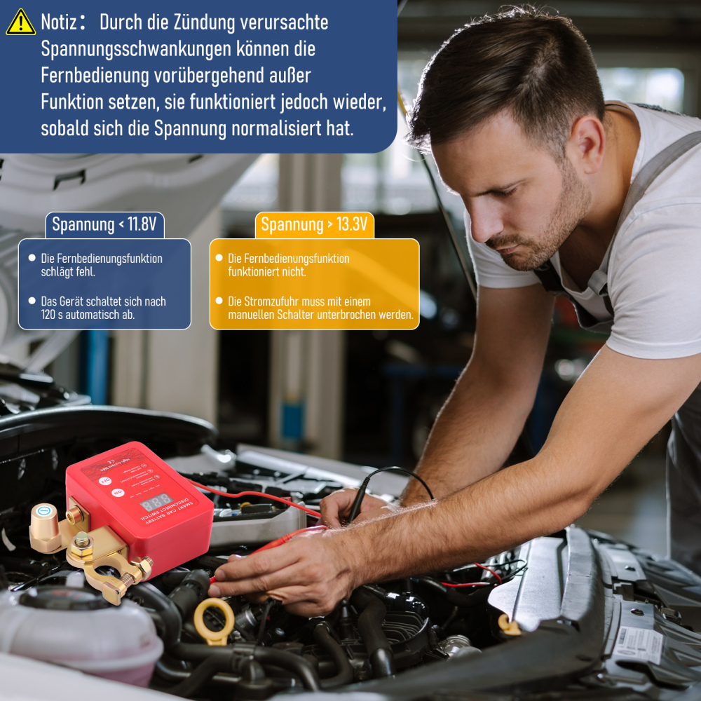 👍Upgrade Intelligenter Schutz】Autobatterie trennschalter nimmt intelligenten Chip an, aufgerüstete Spannungs-LED-Anzeige, Sie können die Batteriespannung jederzeit überprüfen, wenn die Spannung niedriger als 11,8V ist, schaltet es sich automatisch nach 120 Sekunden ab, verhindert, dass die Batterie ausläuft und spart Strom. Wenn die Spannung höher als 13,2 V ist, ist der Fernbedienungsschalter ungültig (die Reichweite der Fernbedienung beträgt 100 Meter), um zu verhindern, dass die Fernbedienung versehentlich gedrückt wird, um den Strom während der Fahrt abzuschalten, und es kann nur manuell ein- und ausgeschaltet werden.