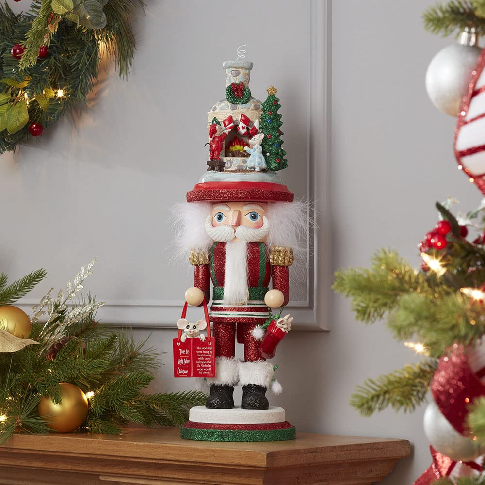 Hollywood Stockings On Fireplace NutcrackerMade of wood solid, resin, wood composite and paint/micaItem Size: 17.5 inches tallDesigned by renowned artist Holly Adler, Hollywood Nutcrackers is a whimsical collection of nutcrackers created exclusively for Kurt Adler. This unique 17.5-inch Stockings on Fireplace Nutcracker features glitter detailing all around. In one hand it holds a inch'Twas the Night Before Christmas inch book ornament and in the other a stocking ornament. Topped off with decorated scenic stockings hanging on a fireplace hat. This nutcracker is a stunning addition to any holiday décor