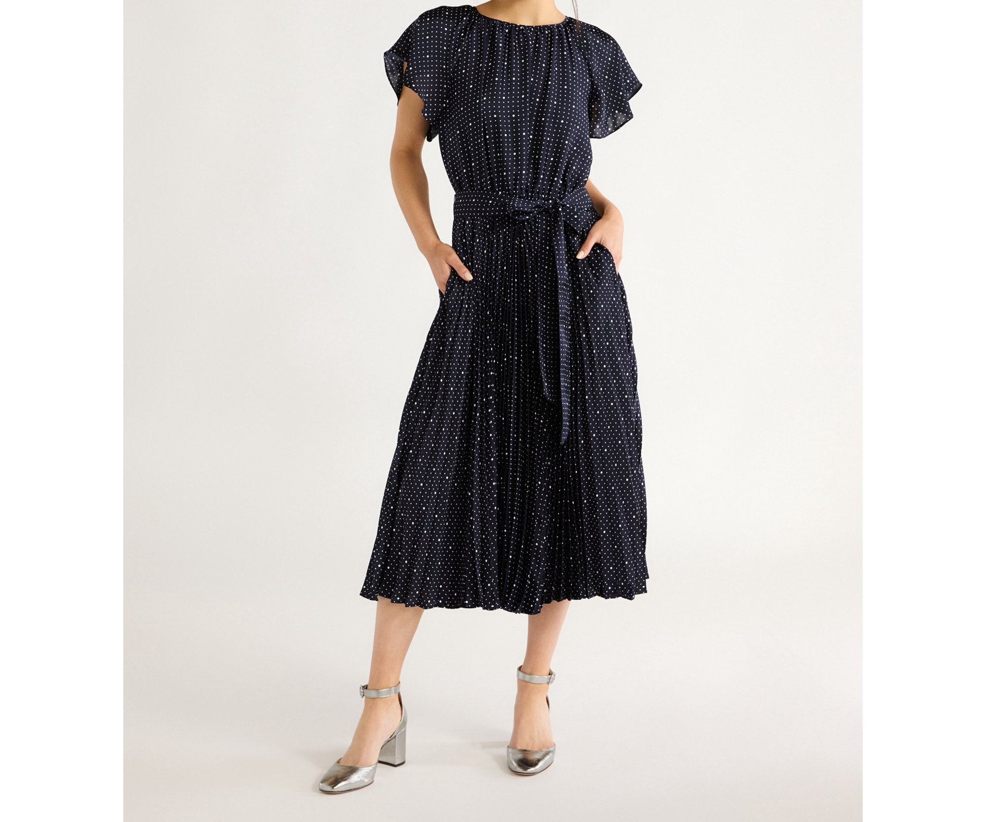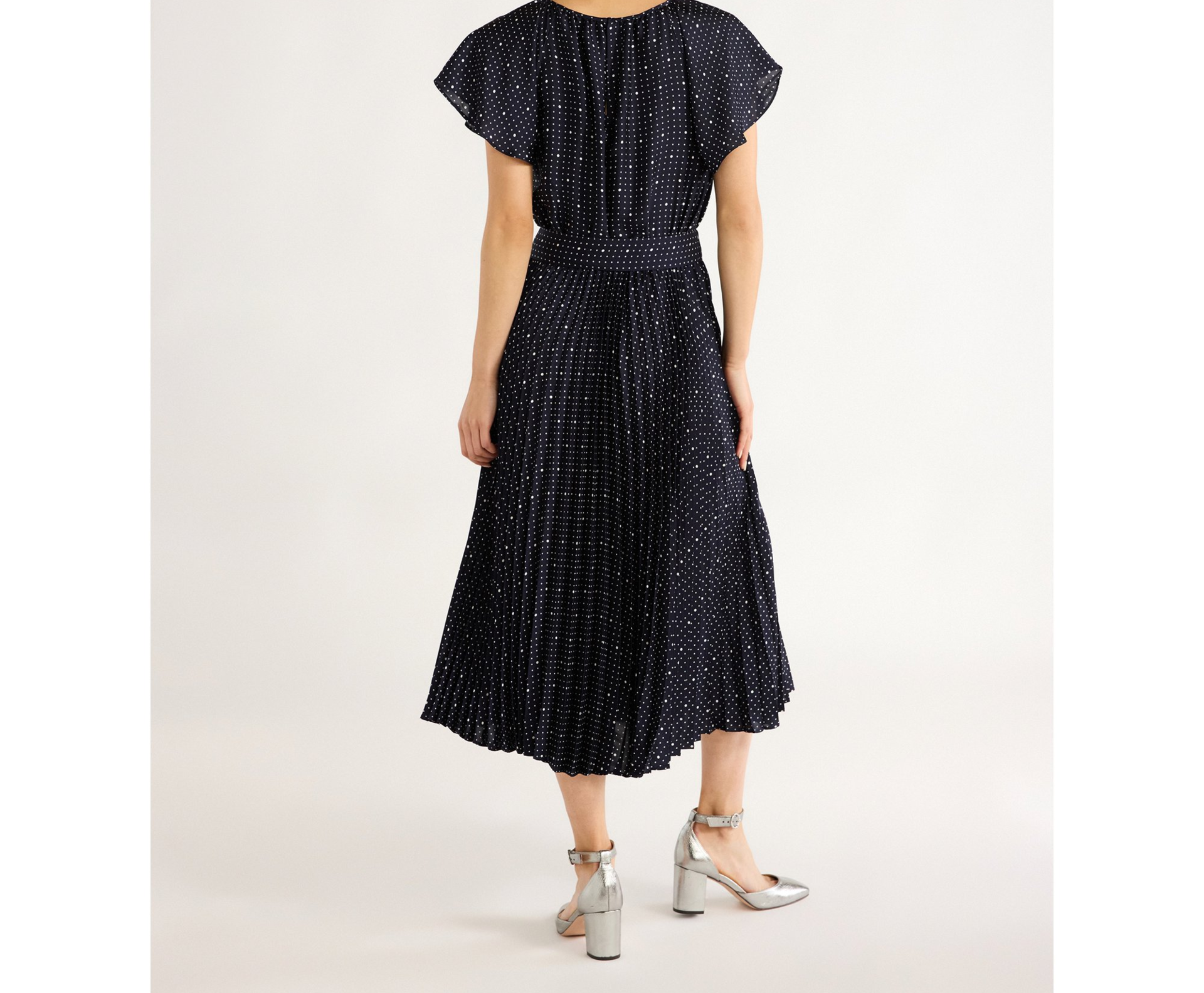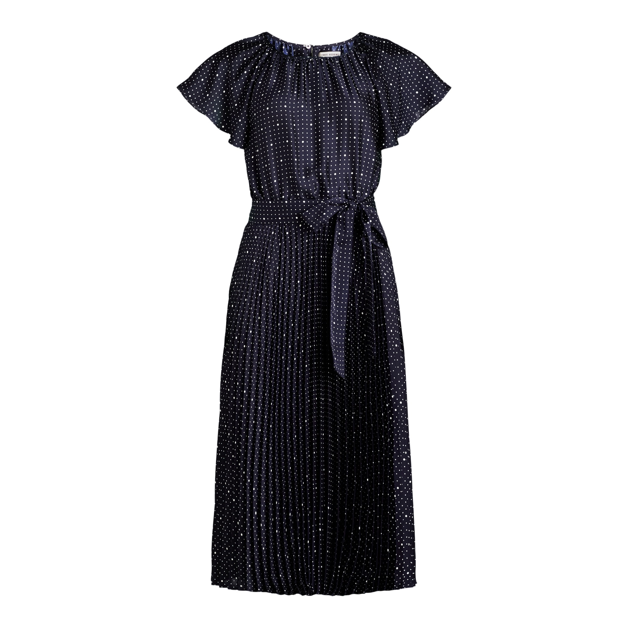 Free Assembly Womens Pleated Midi Dress Flutter Sleeves Darkest Navy Dot Size XS