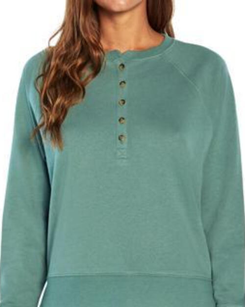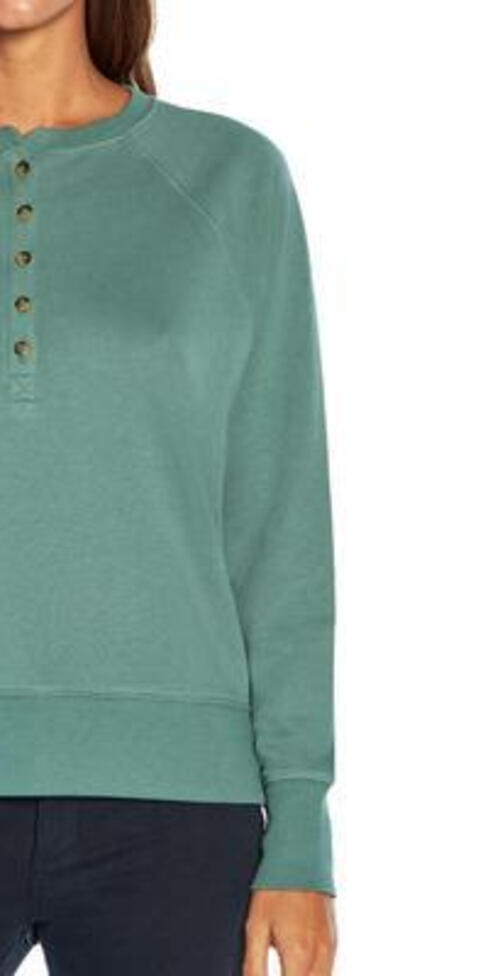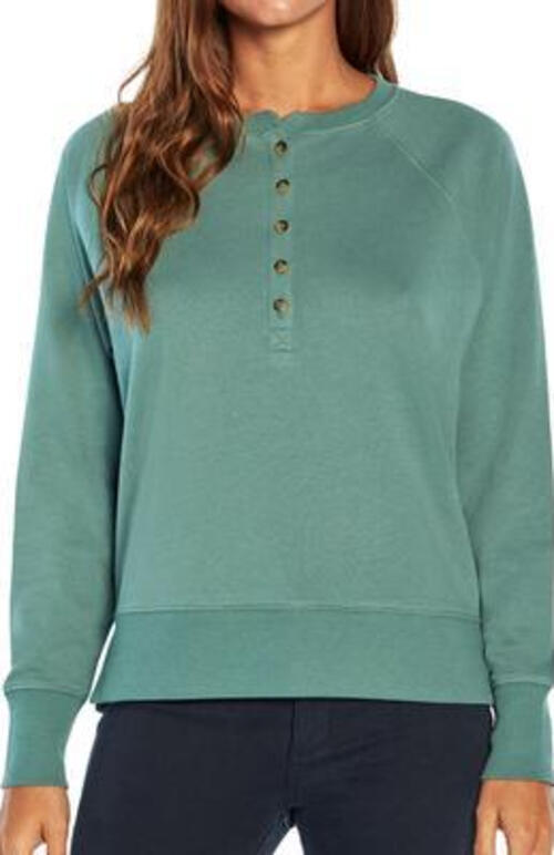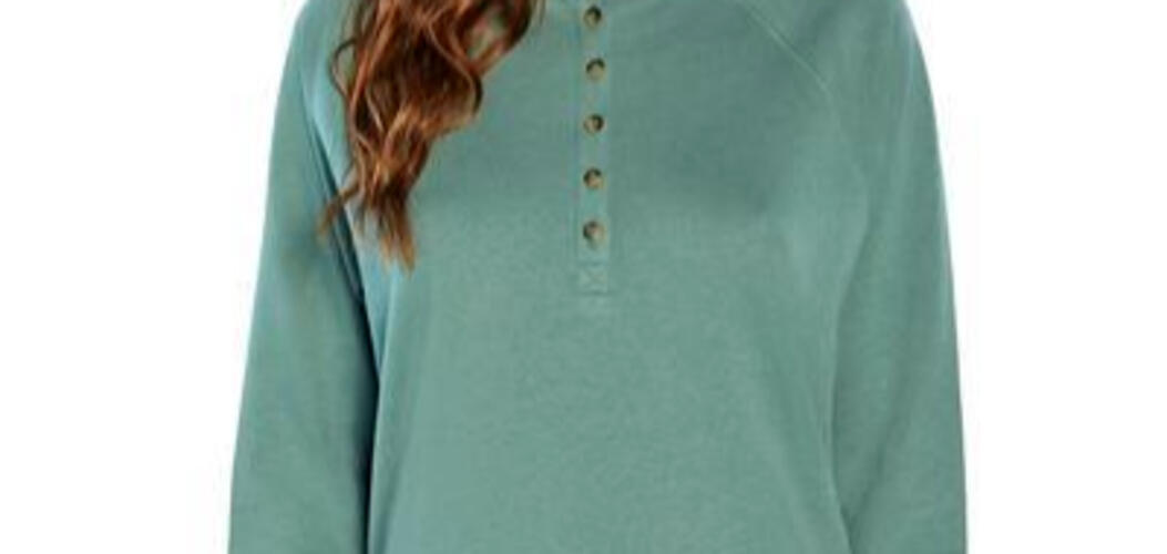 This sweatshirt is made of a cotton/poly blend and is super soft. The long raglan sleeves and henley front buttons make this casual sweatshirt perfect for all your fall and winter needs. Ribbed waistline with side slits for easy movement GAP logo tag stitched in the seam on the left hip. Made of 81% Cotton / 19% Polyester. Machine washable. This is a women s size X-Small. Approximate measurements: 23 length 20. chest 28 raglan sleeve length.