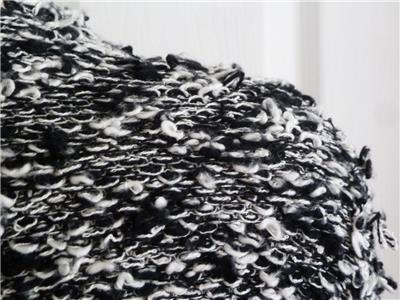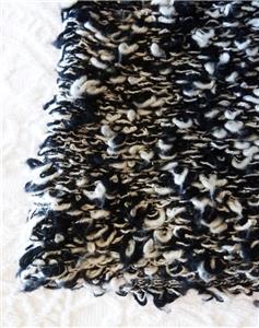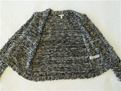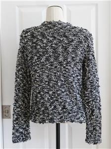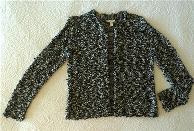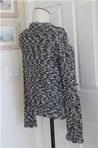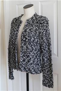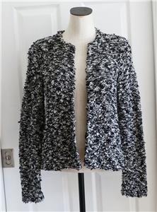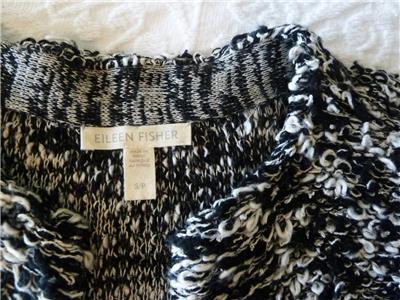 Versatile black and white loop knit sweater jacket from designer Eileen Fisher, Made in Peru. Tag size S, may work for M, please check measurements below. 100% Peruvian Organic Cotton, hand wash or dry clean. Soft, multi yarn loops throughout. Open front, long sleeves. Very good condition, possibly a loop or two a bit longer than original, impossible to tell. Retail $318.00. Best appreciated by reviewing all eleven photos.