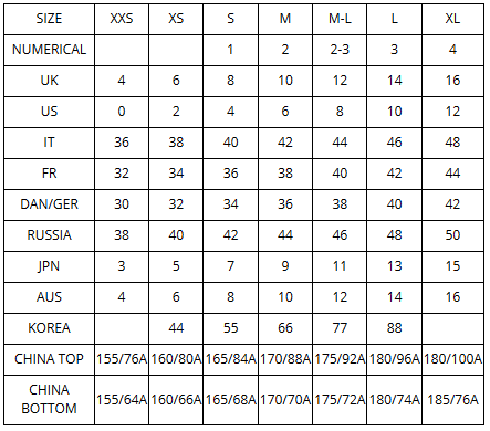 | SIZE | XXS | XS | S | M | M-L | L | XL |