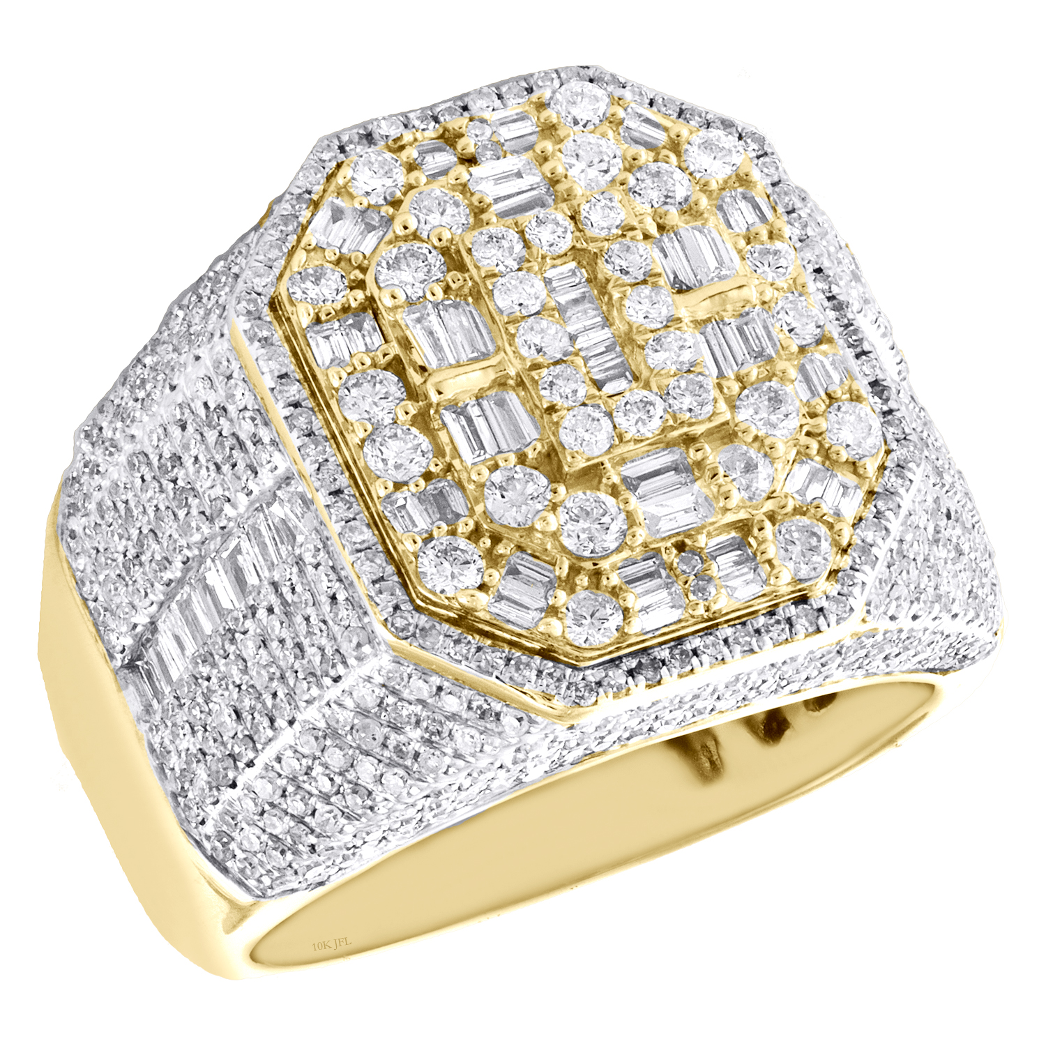 A bold and manly look, this sparkling diamond ring is just the perfect style for him. Brilliantly casted in 10K Yellow Gold, this ring features sparkling diamonds set in 19mm wide frame. This ring design was intricately thought out so it can be worn for any occasion, no matter how casual or fancy. Tiered Raised Octagon frame with diamonds is the focal point of this fancy statement band, making a bold fashion statement. Make an impression with this exclusive ring captivating 2.65 ct. t.w. of genuine Round and Baguette cut diamonds, with high polished to a lustrous shine. This ring is comfort fit and weighs approx. 14.3 gr. All diamonds are 100% genuine and are matched to perfection. The diamonds are secured in Channel and Prong setting, making the overall appearance larger and lustrous. Available in size 10. If a different size is needed, please send us a message, sizing charges apply.