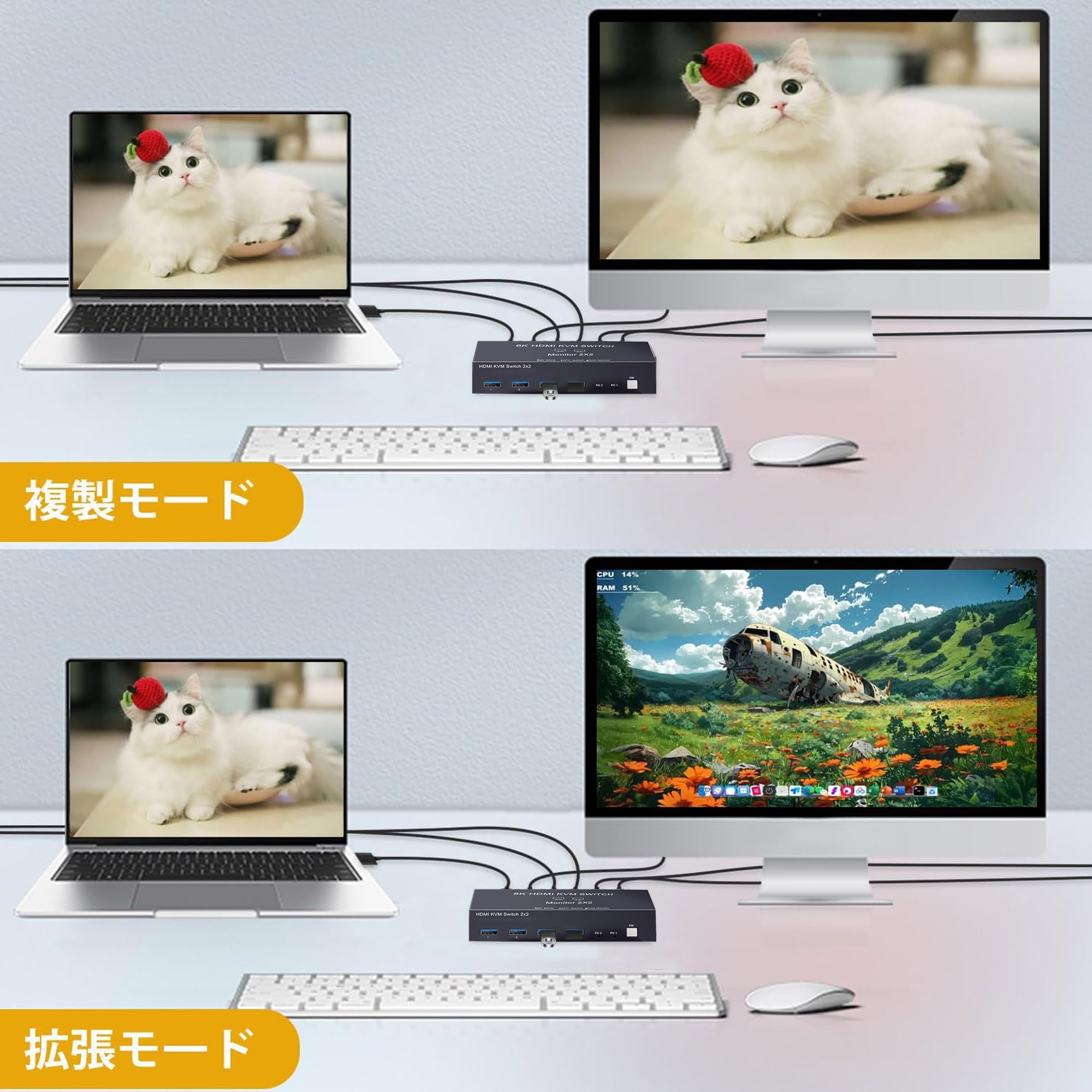 Dual-Monitor Simultaneous Output KVM Switch: This HDMI KVM switch features two HDMI input ports, two HDMI output ports, and four USB 3.0 output ports, allowing you to simultaneously connect two computers and up to four USB 3.0 devices. Easily switch between two PCs via this 2-PC/2-Monitor HDMI KVM switch, sharing two monitors, a keyboard, and a mouse. Instantly access the input of your PC with a single touch, and switch between them as needed. (Note: Please power the product with the included DC adapter.) ■ 8K@60Hz Resolution: This HDMI switch supports resolutions up to 8K and 4K@144Hz, delivering stunning, uncompressed UHD (Ultra High Definition) video to TVs, projectors, monitors, and other displays. Users can enjoy a clear, high-quality visual experience, a more immersive viewing experience, and a larger workspace. ■ Supports both Duplicate and Extend Modes: Extend mode allows you to display on separate screens, while copy mode displays on the same screen. To display on dual displays, both HDMI ports must be connected. On a PC capable of displaying multiple monitors, you can switch between duplicate and extended modes by pressing "Window + P." ■ Convenient Switching Options for Easy Operation: Smoothly switch between two PCs using the switch button or the included controller. (Note: Inputs and outputs must be matched one-to-one: "HDMI OUT A" displays the "HDMI IN A" screen, while "HDMI OUT B" displays the "HDMI IN B" screen.) One-touch buttons allow quick access, and the controller can be placed in a drawer, keeping your desk neat and tidy. (Hotkey switching is not supported.) ■ Versatile: This KVM switch is easy to use and can output two monitors simultaneously, making it flexible for use in offices, classrooms, conference rooms, game rooms, laboratories, and anywhere you need to manage multiple devices. Dual Monitor HDMI KVM Switch, 8K 60Hz, 2 HDMI Inputs, 2 Outputs, Simultaneous Display, USB 3.0 KVM Switch, Keyboard, Mouse, Printer, Scanner Sharing, 2 USB Inpu