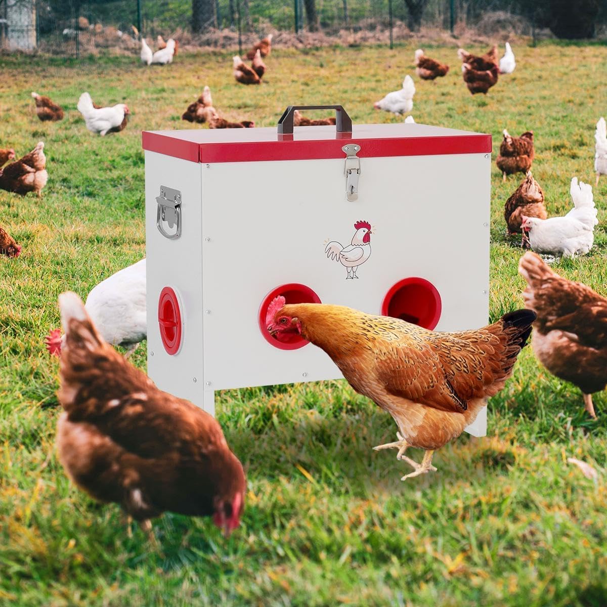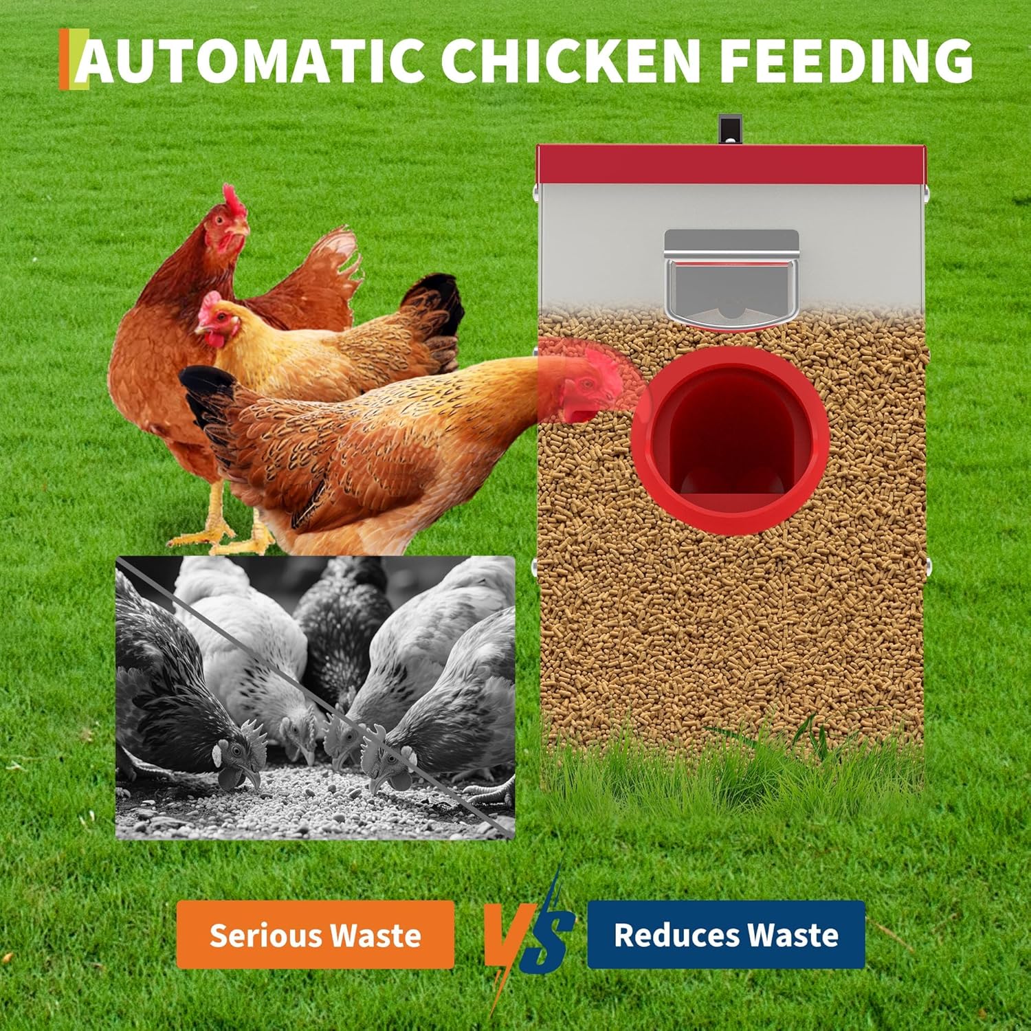 - Automatic Chicken Feeder: The automatic feeding system can provide feed for chickens at any time, reducing feed spillage and mess, and keeping the feeding area clean. The large-capacity feed trough and feeding ports ensure that your chickens will automatically replenish the right amount of feed when eating.