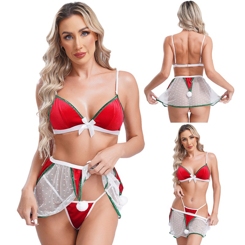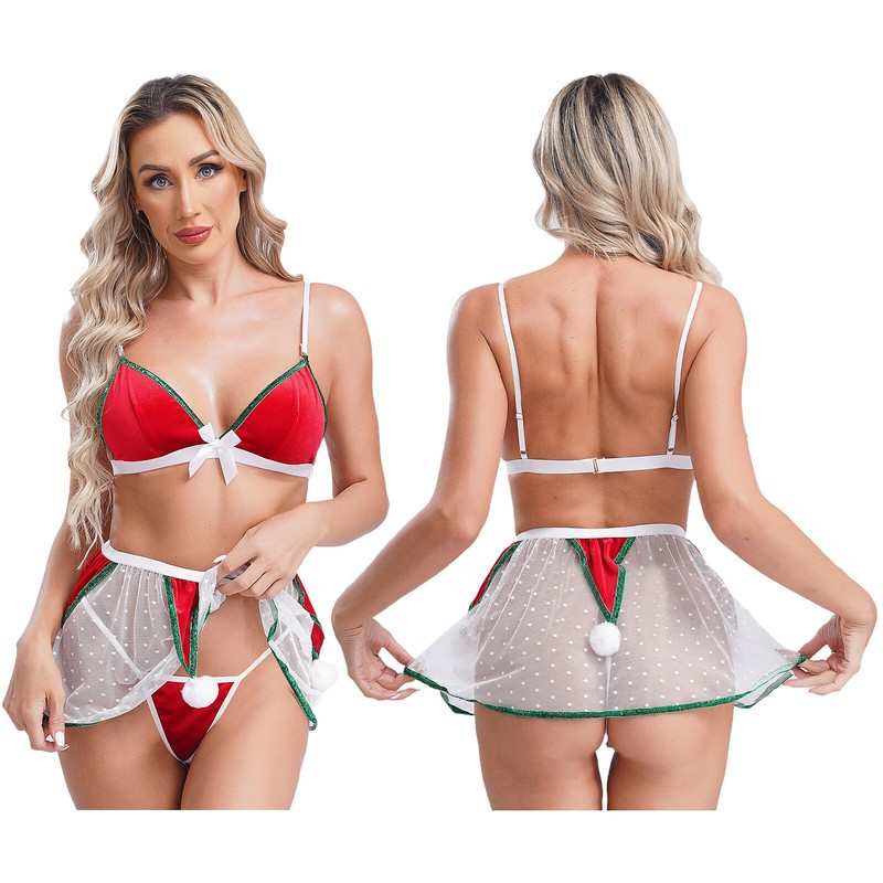3-teiliger Weihnachts-Bikini-BH, Tanga und Netz-Minirock für Damen, die Sie super sexy und attraktiv machen.