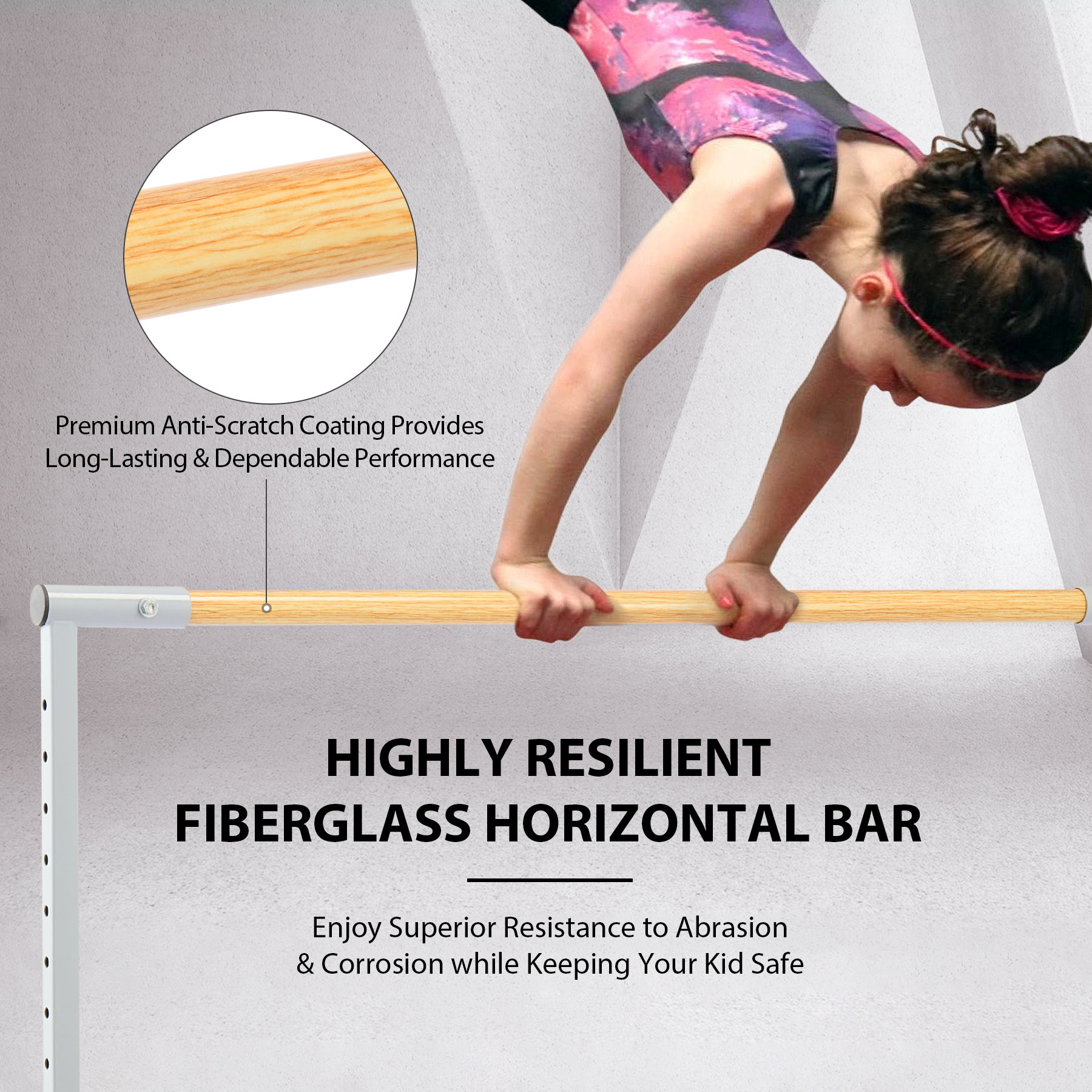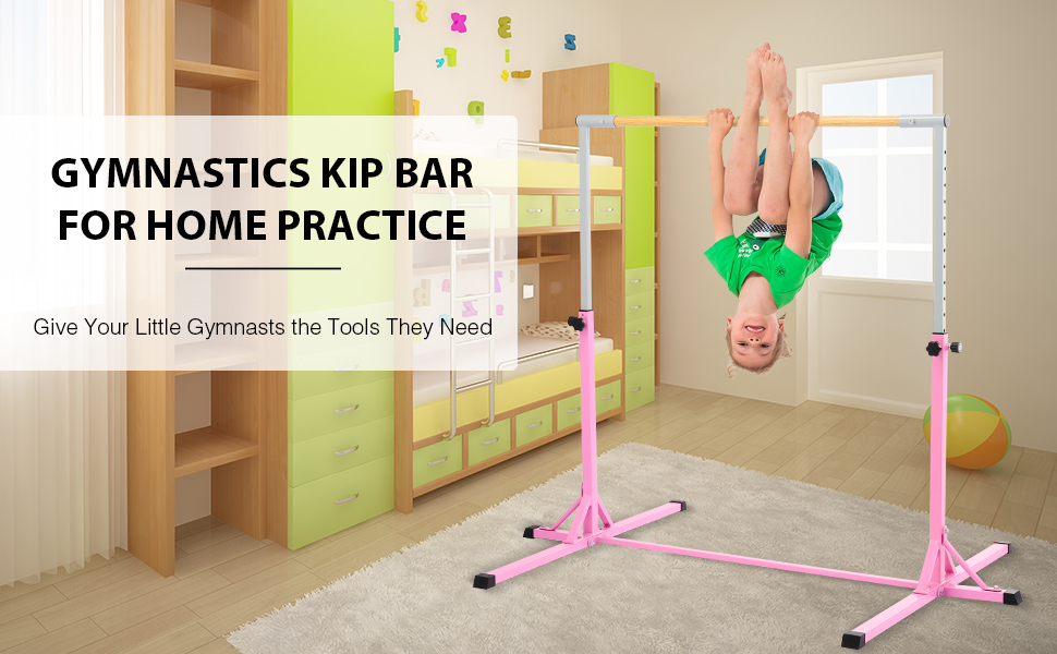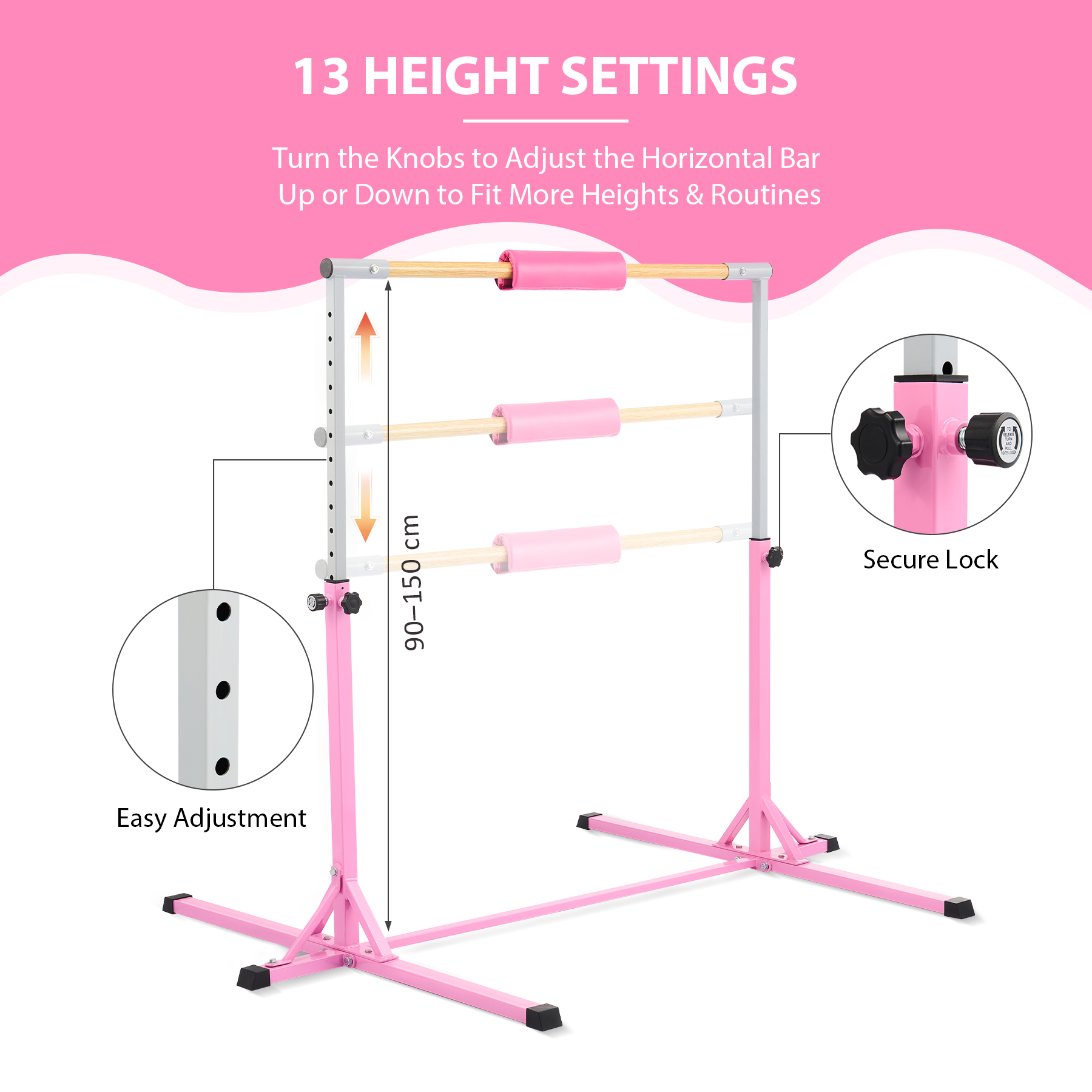 This professional gymnastics bar by Zelus is constructed from durable Q235 steel and fiber-reinforced plastic to boast its durability enabling it to easily support up to 330 pounds / 150kg. The cross bar and the triangle brackets at the bottom also greatly improve the bar's stability to ensure safety. Adjustable from 90 cm to 150 cm to offer 13 height levels, this gymnastics kip bar can accommodate different ages and heights, accompanying their growth and development. Thanks to its clear design and detailed instructions, you will assemble and install this gymnastics equipment at home in no time.