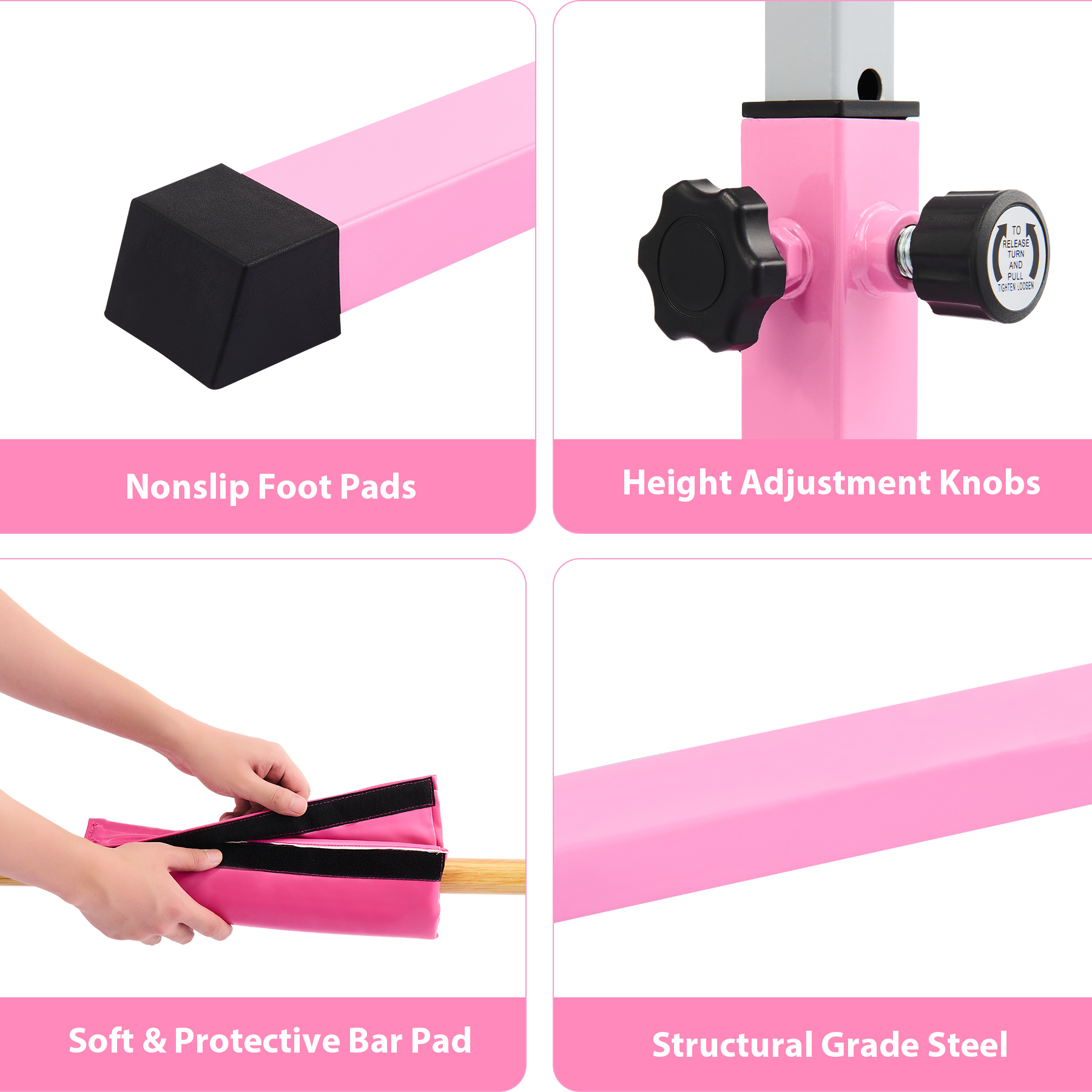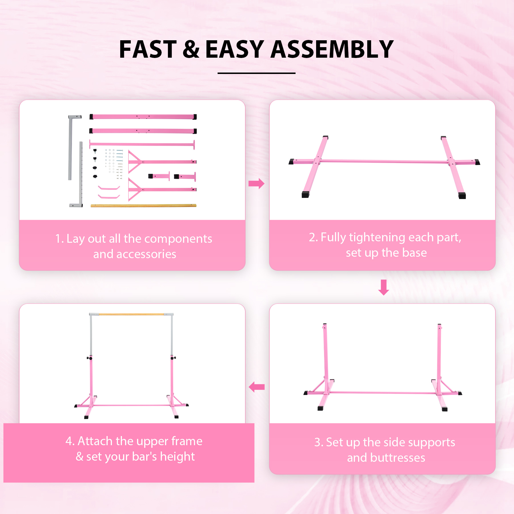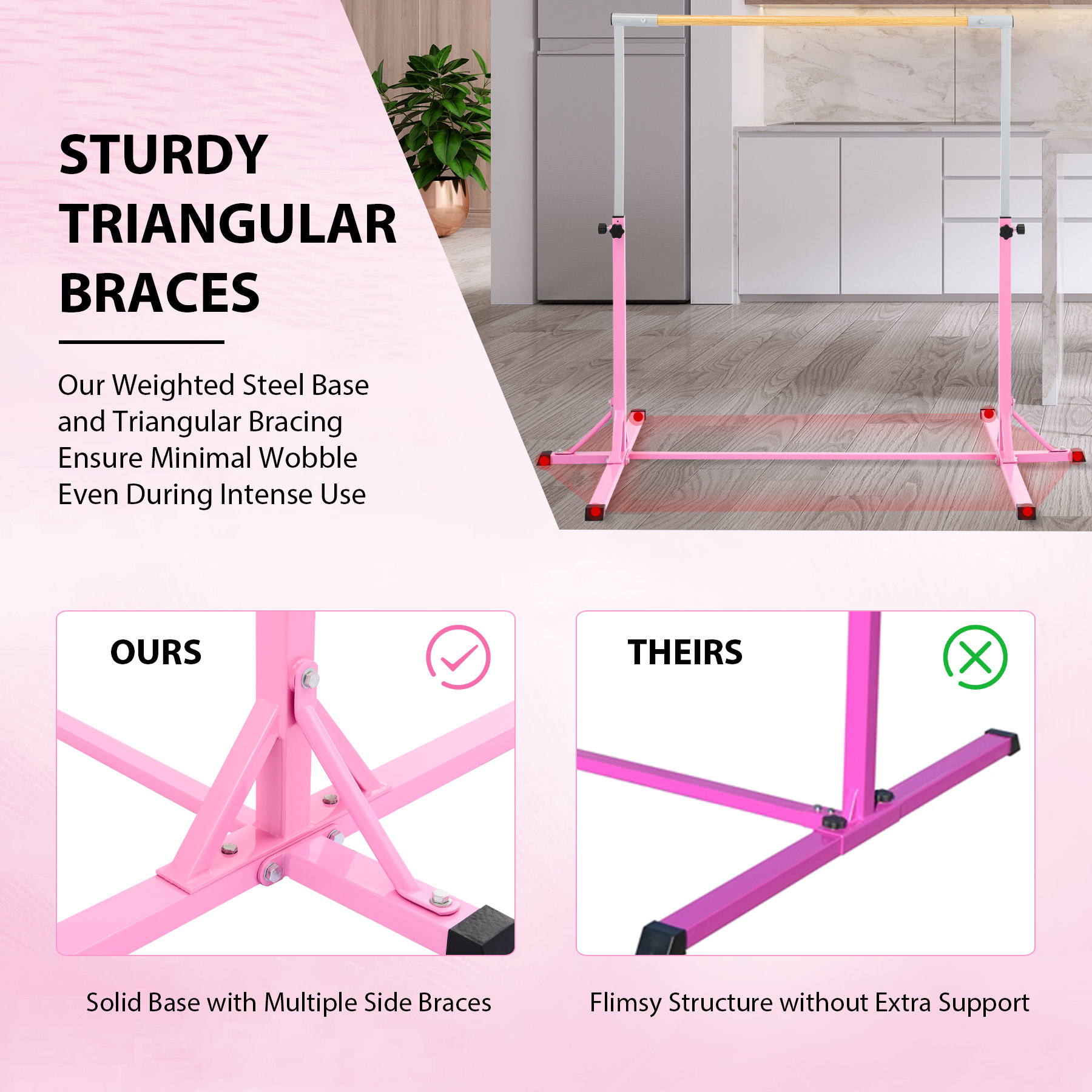This professional gymnastics bar by Zelus is constructed from durable Q235 steel and fiber-reinforced plastic to boast its durability enabling it to easily support up to 330 pounds / 150kg. The cross bar and the triangle brackets at the bottom also greatly improve the bar's stability to ensure safety. Adjustable from 90 cm to 150 cm to offer 13 height levels, this gymnastics kip bar can accommodate different ages and heights, accompanying their growth and development. Thanks to its clear design and detailed instructions, you will assemble and install this gymnastics equipment at home in no time.