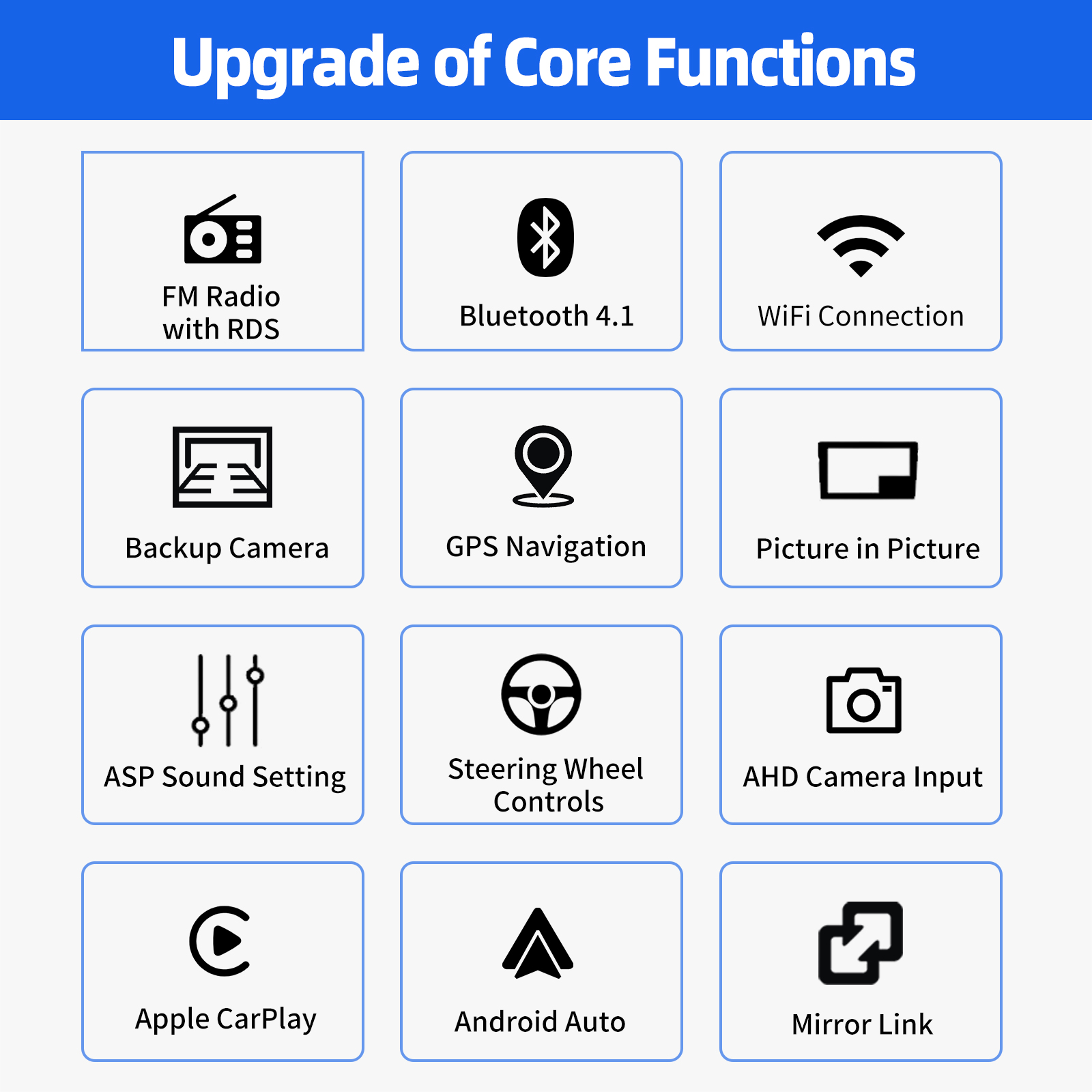 RDS/FM Radio and Bluetooth and ASP Sound: Supports Bluetooth 4.1, with built-in microphone so you can make hands-free calls while driving. Support access to phone book, music playback interface, etc. RDS supported. You can save 18 FM radio stations. Built-in ASP chip. Supports 32-band EQ setting, which can be adjusted according to your personal preference. Which is very similar to your original sound. 4 x 45W amplifier, surround sound and subwoofer output