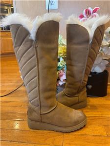 This boot is literally spilling over with comfort and warmth. Luxurious Toscana sheepskin billows from the top of this water-resistant suede style, and stitched details along the back shaft will make everyone do a double take.
