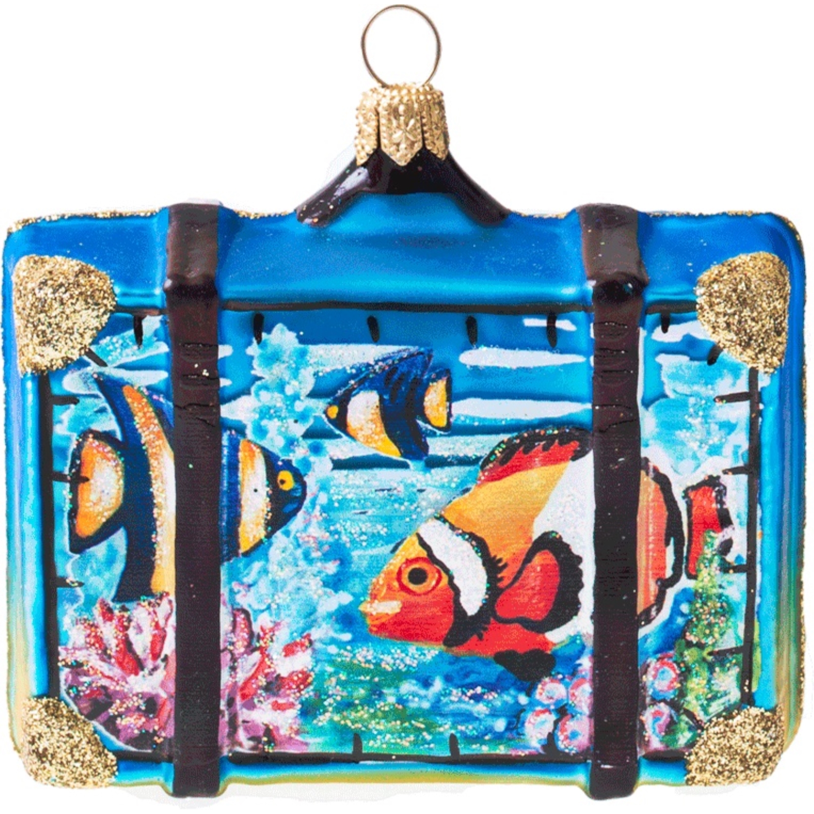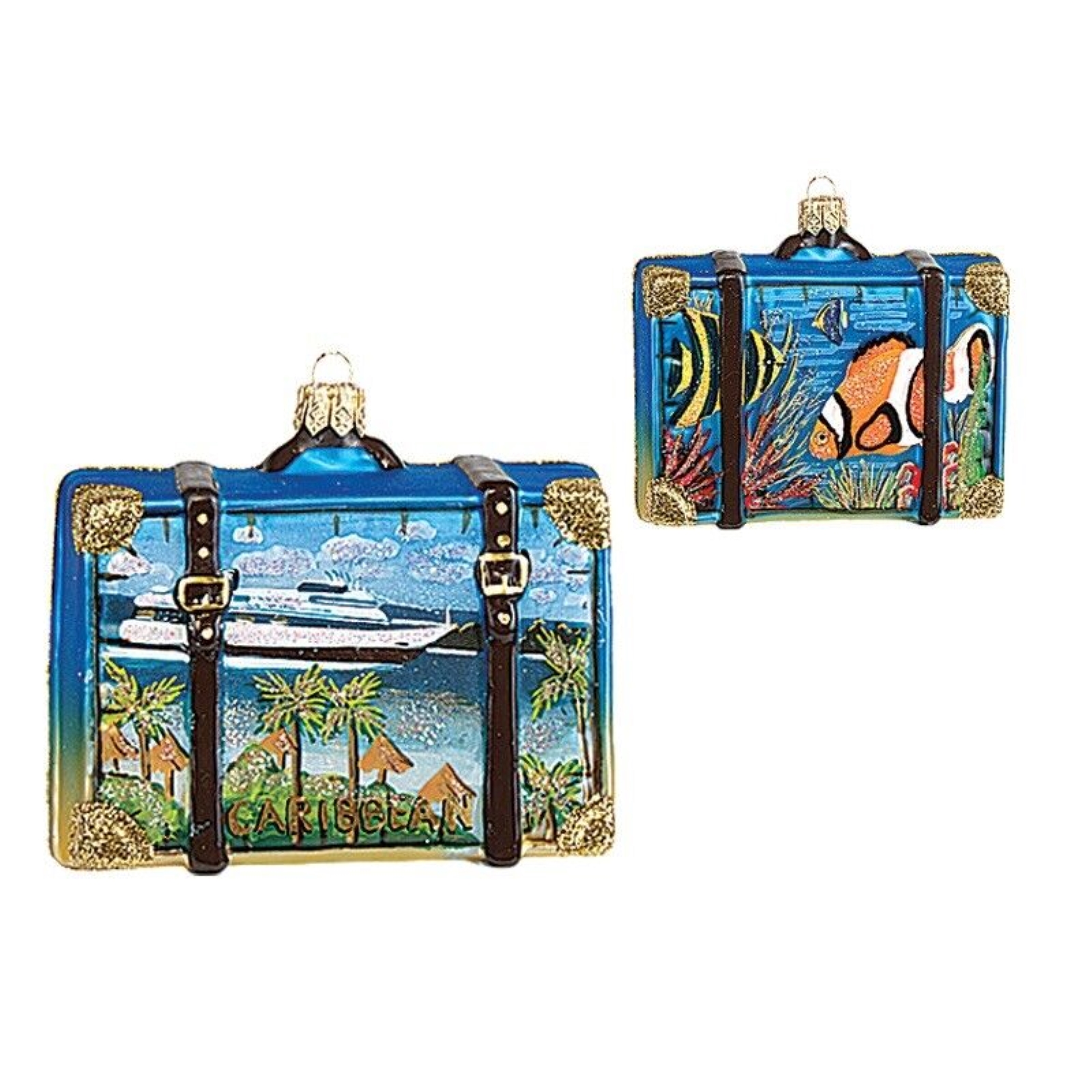 Caribbean Travel Suitcase Ornament. Handcrafted in Poland. Hand painted by Polish artisans. Made from mouth blown glass. Approximately 3.3 inches long (8cm). Comes packaged in a gift box. Includes ONE ornament - picture shows front and back of one ornament. Imported by Pinnacle Peak Trading Company.