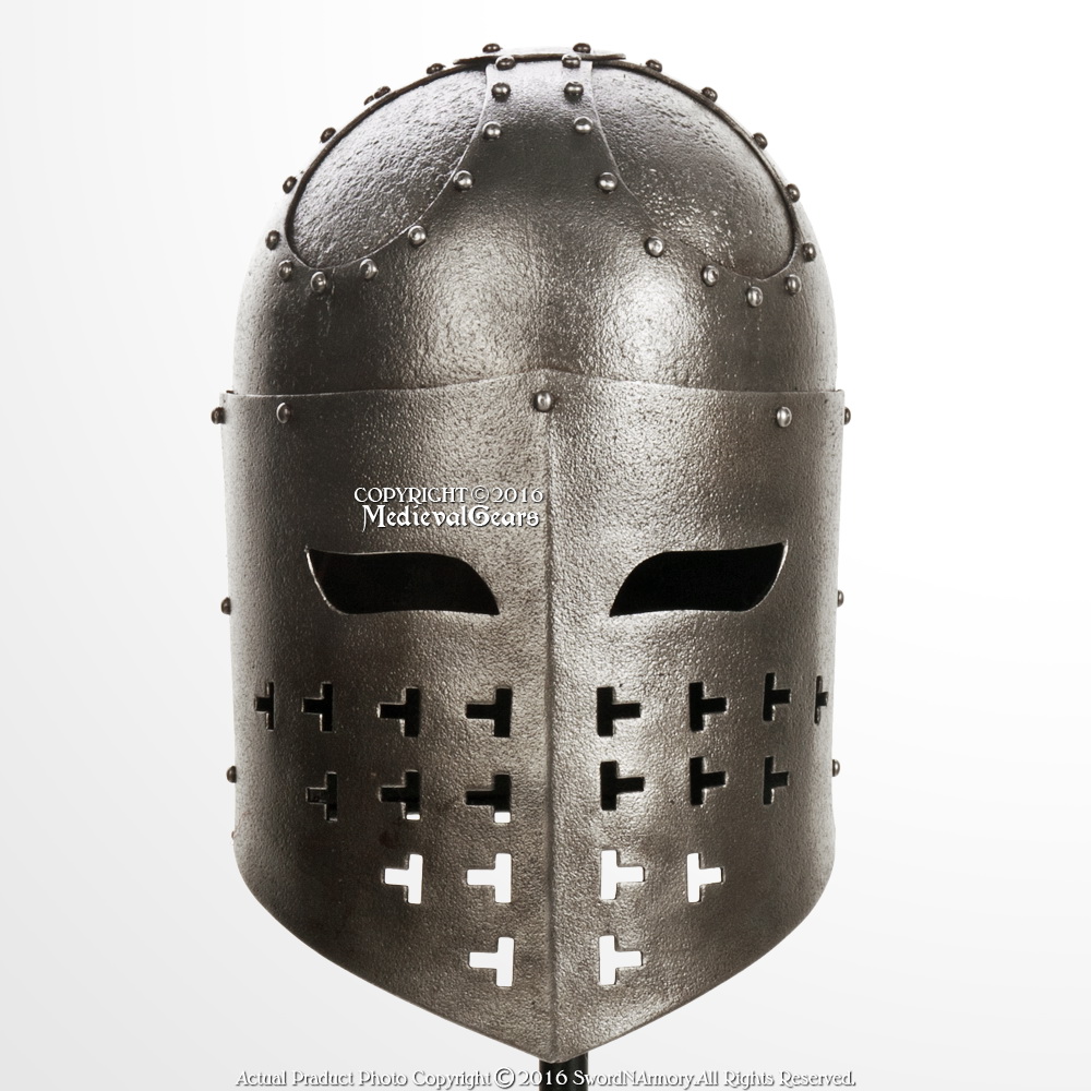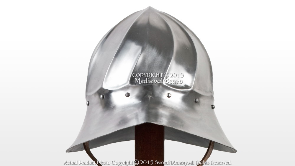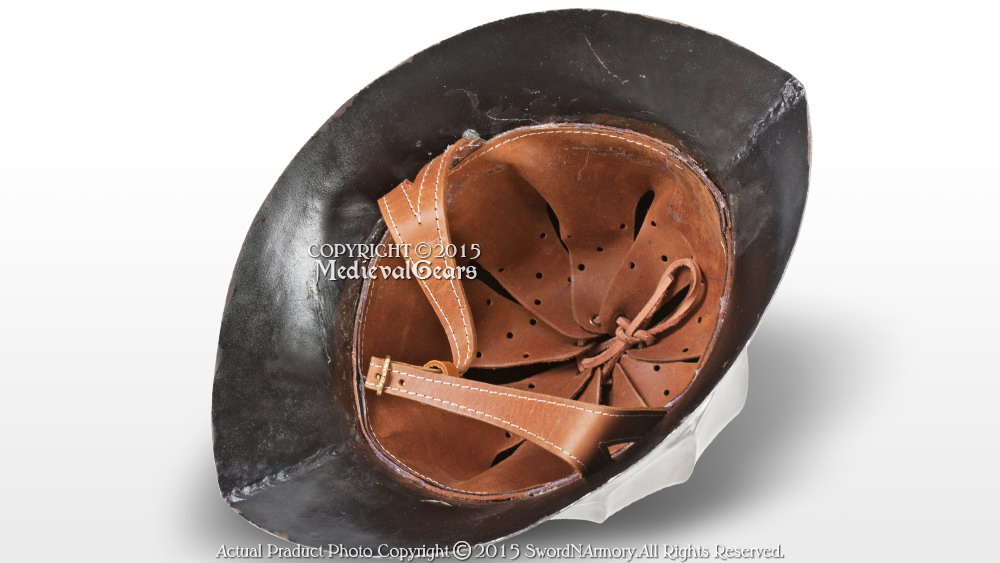 This helmet is modeled of a collection from Metropolitan Museum of Art in New York. It's made from 16 gauge steel with riveted leather liner and adjustable chin strap.