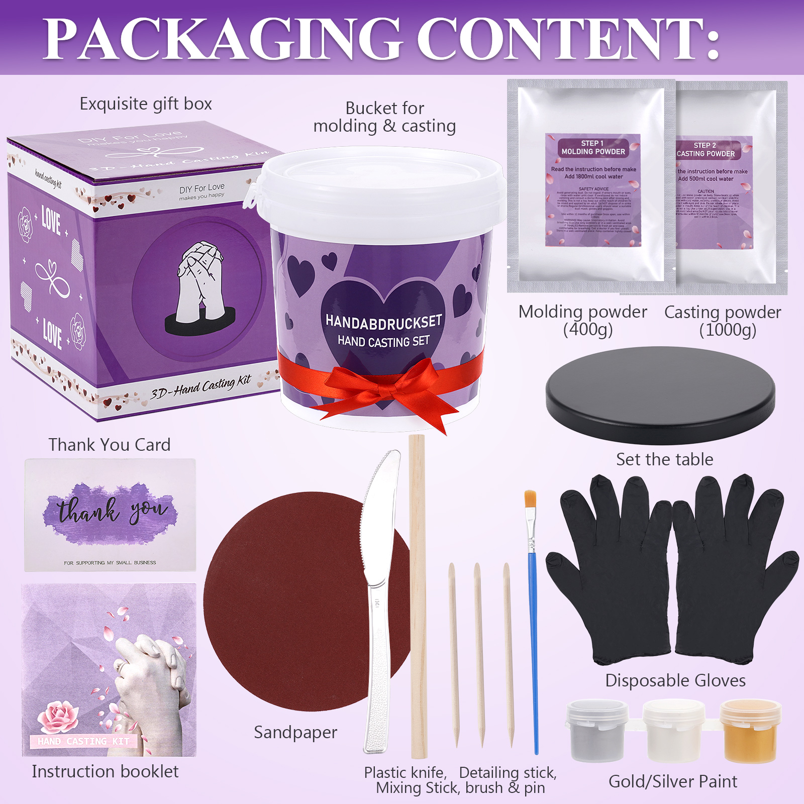 19Pcs Purple Comprehensive Kit with stand base Contents: Your Keepsake Hand Casting Kit includes 1x Stand Base, 1x plastic molding bucket, 1x 400g molding powder, 1x 1kg Casting powder, 1x gold metallic paint, 1x silver metallic paint, 1x white metallic paint, 1x Plastic Knife, 3x Detailing bamboo stick, 1x Mixing Stick, 1x paint brushes, 1x Sandpaper, 2x Disposable Gloves , 1x Thank You Card, 1x Exquisite qift box and a detailed instructions to ensure a smooth and enjoyable crafting experience.