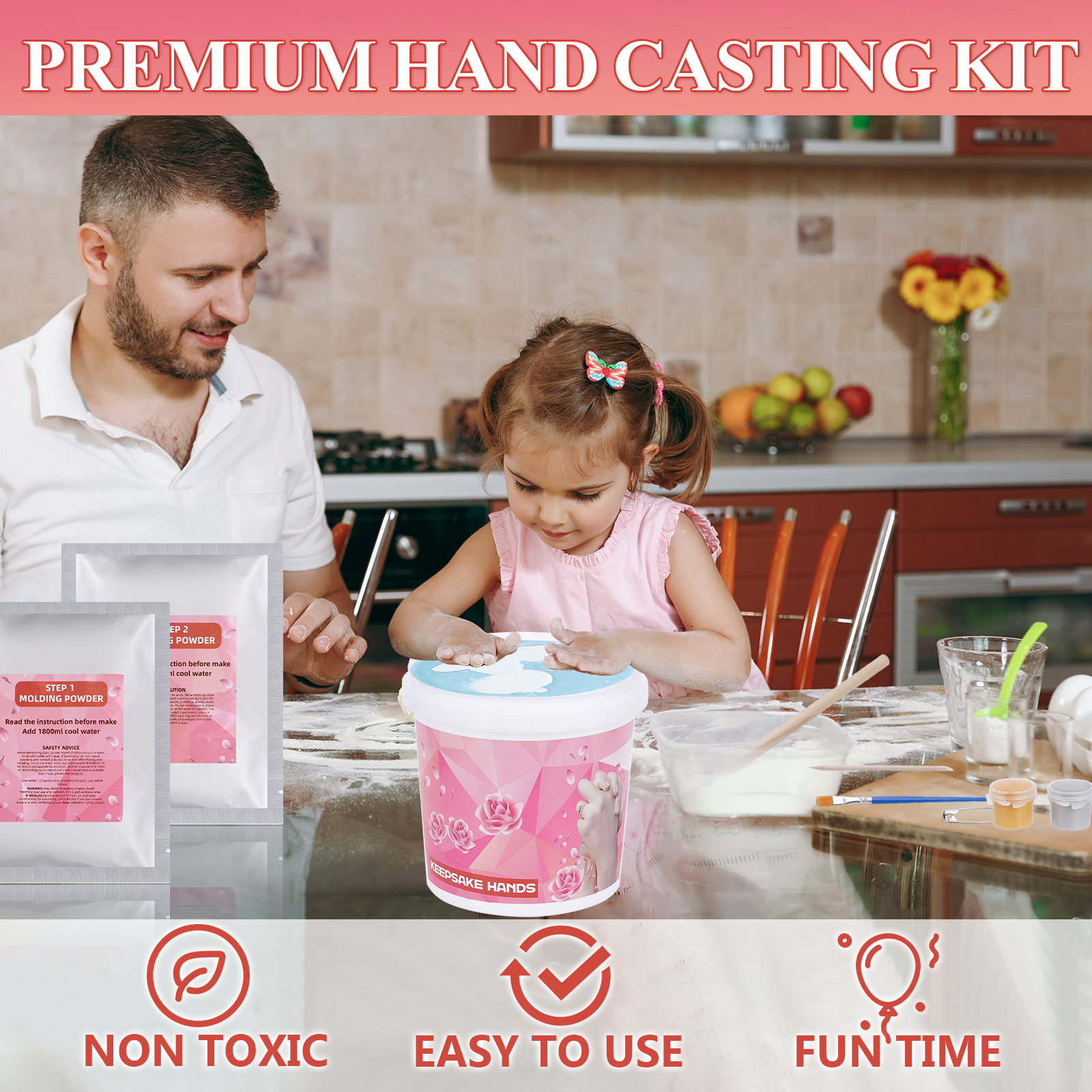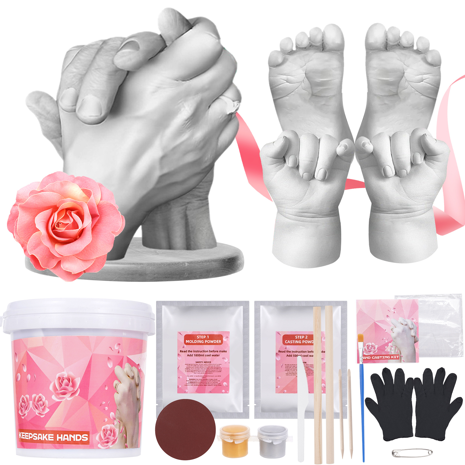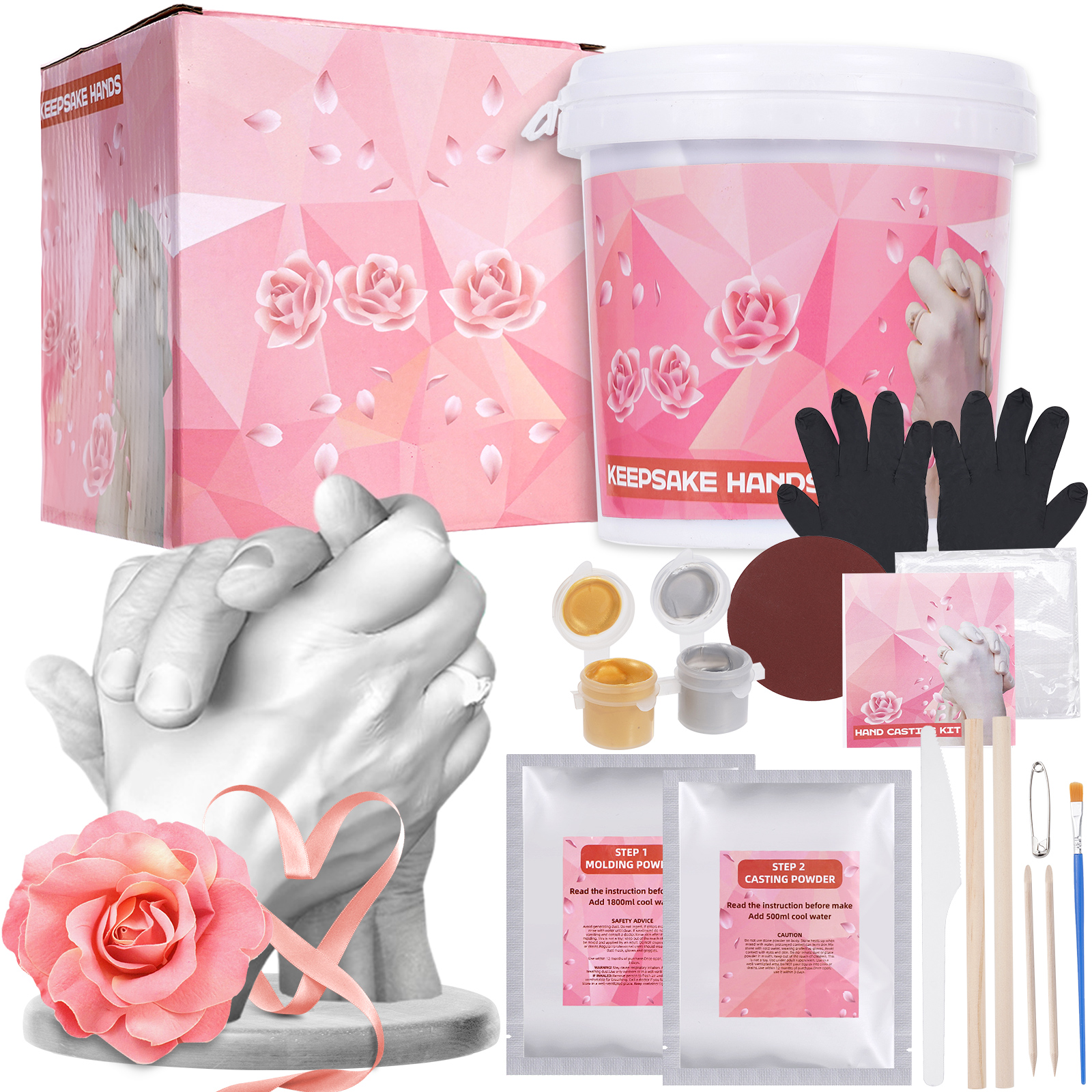 18Pcs Pink Comprehensive Kit Contents: Your Keepsake Hand Casting Kit includes 1x plastic molding bucket, 1x 400g molding powder, 1x 1000g Casting powder, 1x gold metallic paint, 1x silver metallic paint, 1x Plastic Knife, 2x Detailing bamboo stick, 2x Mixing Stick, 1x paint brushes, 1x pin, 1x Sandpaper, 2x Disposable Gloves , 1x Protective table cover, 1x Exquisite qift box and a detailed instructions to ensure a smooth and enjoyable crafting experience.