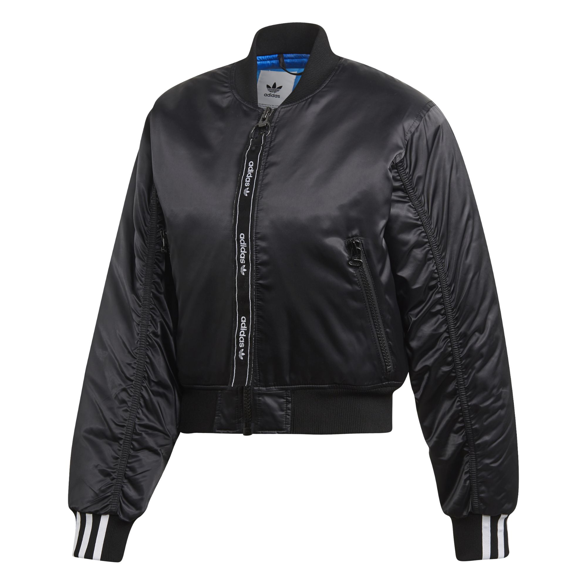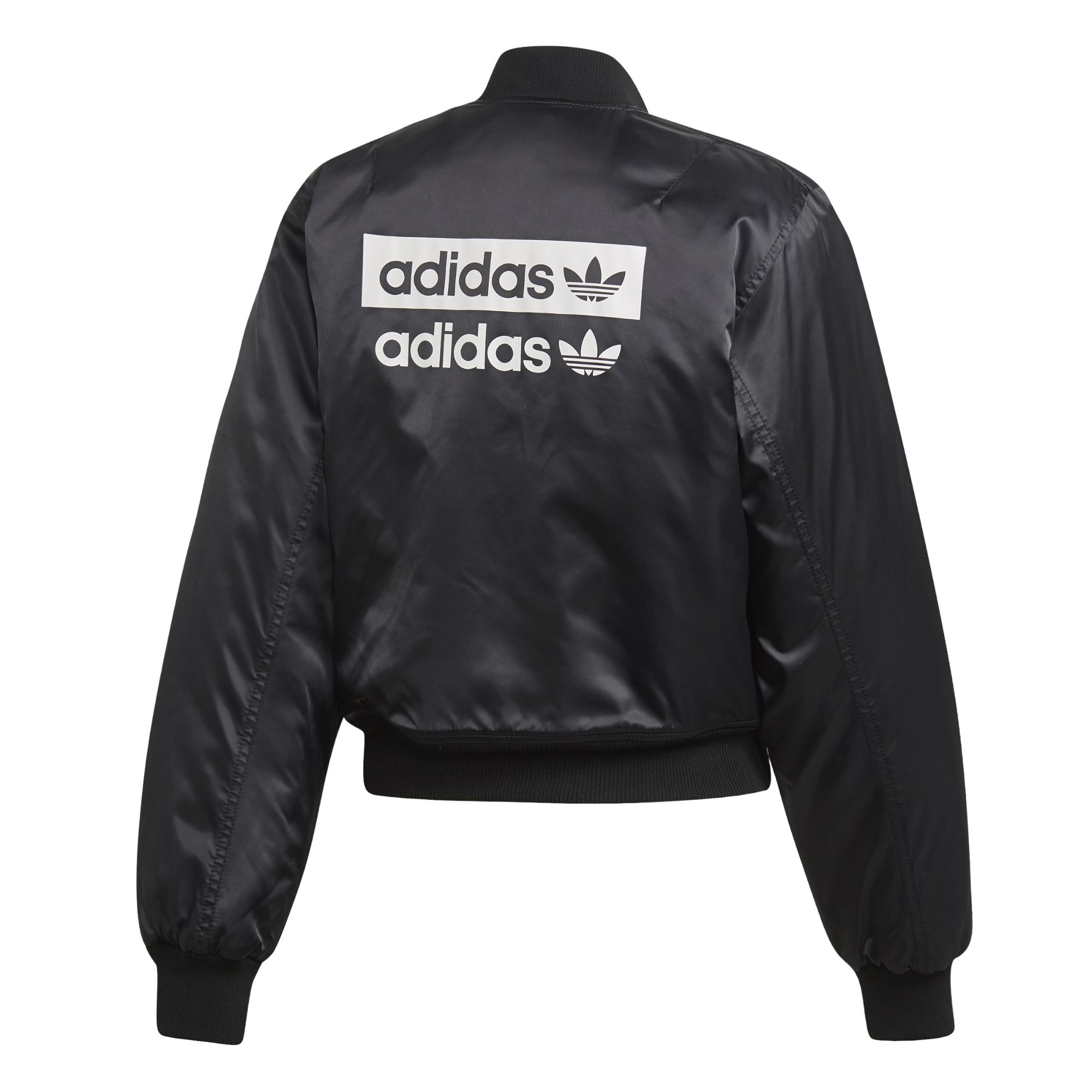 Femminilità senza obiezioni. Questa giacca assicura un look raffinato grazie al taglio corto e al design arricciato sulle maniche. La struttura in satin morbido e leggero è arricchita dal collo a coste stile bomber, il logo del Trifoglio oversize sulla schiena dona un tocco extra di carattere.