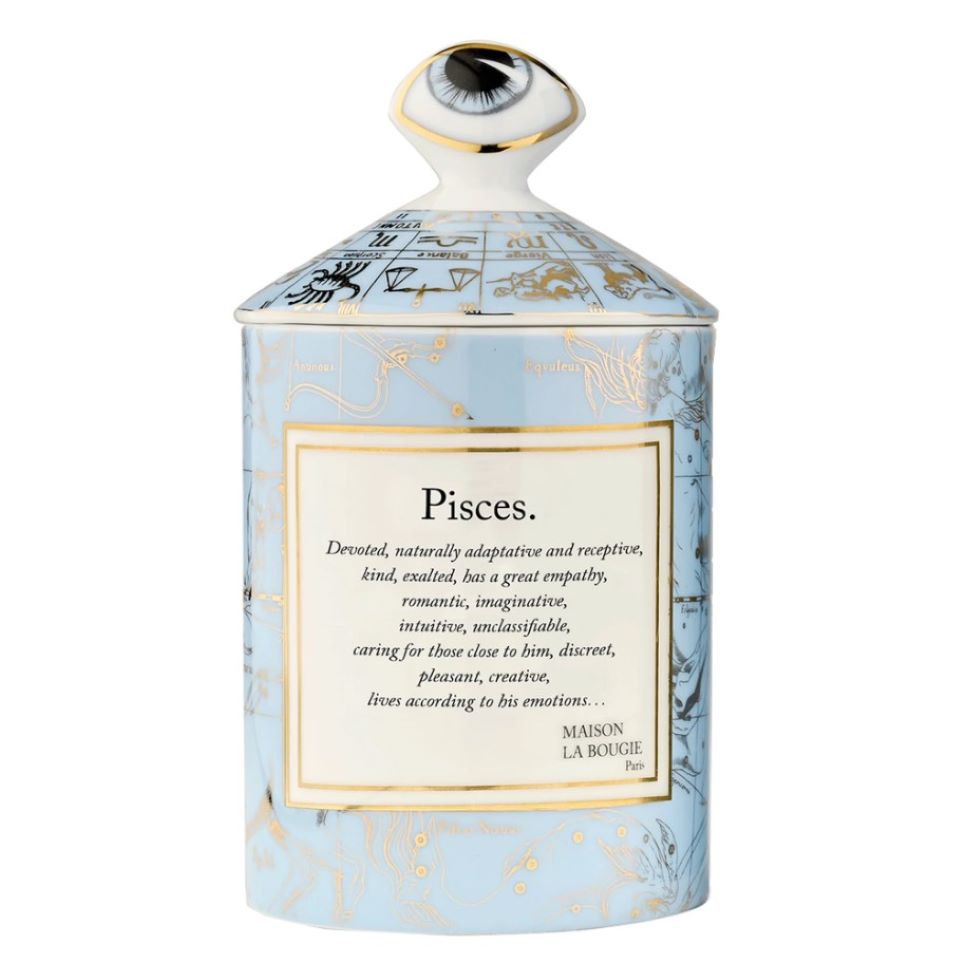 Maison la Bougie Pisces 350g scented candle offers a refined, atmospheric fragrance that blends marine top notes with aromatic thyme and resinous pine, unfolding into a floral heart of jasmine and rose before settling on warm musk and patchouli. Housed in a ceramic vessel and poured in the south of France, this 350 g (12.34 oz) candle reflects Maison la Bougie's artisanal approach to craftsmanship and fragrance composition. The scent sits within an aquatic-woody-floral family, creating a fresh yet enveloping mood well suited to living rooms, bedrooms, bathrooms, or spa-like settings. Use when seeking a calming, evocative ambiance or to complement coastal and contemporary interiors. Burn times and care follow standard luxury candle guidelines; the candle is ideal as a centerpiece or for layered home fragrance styling.