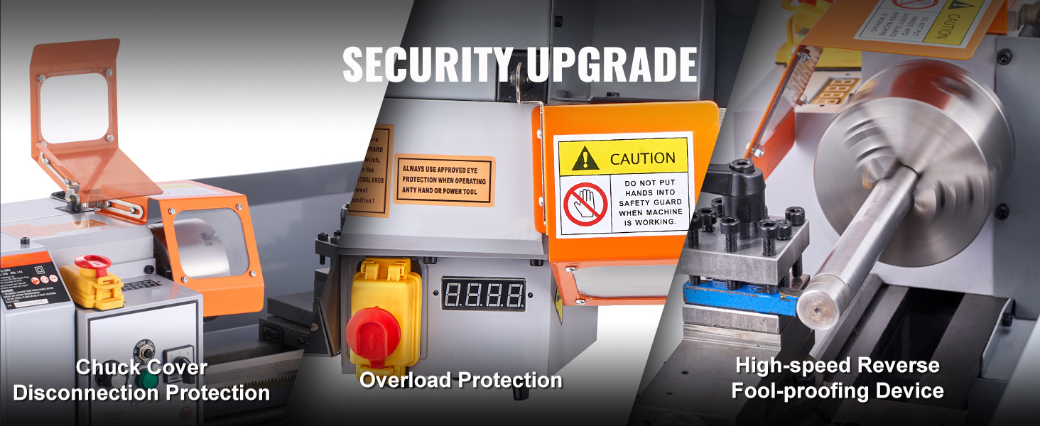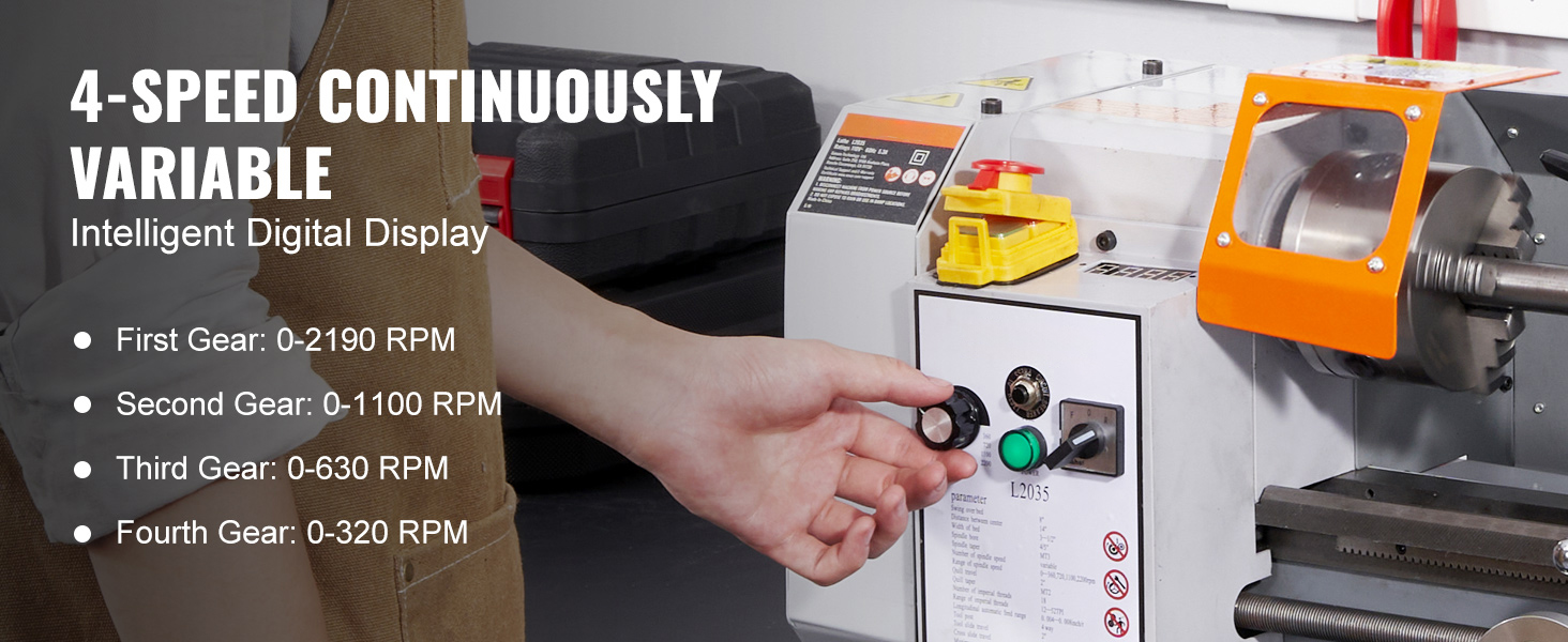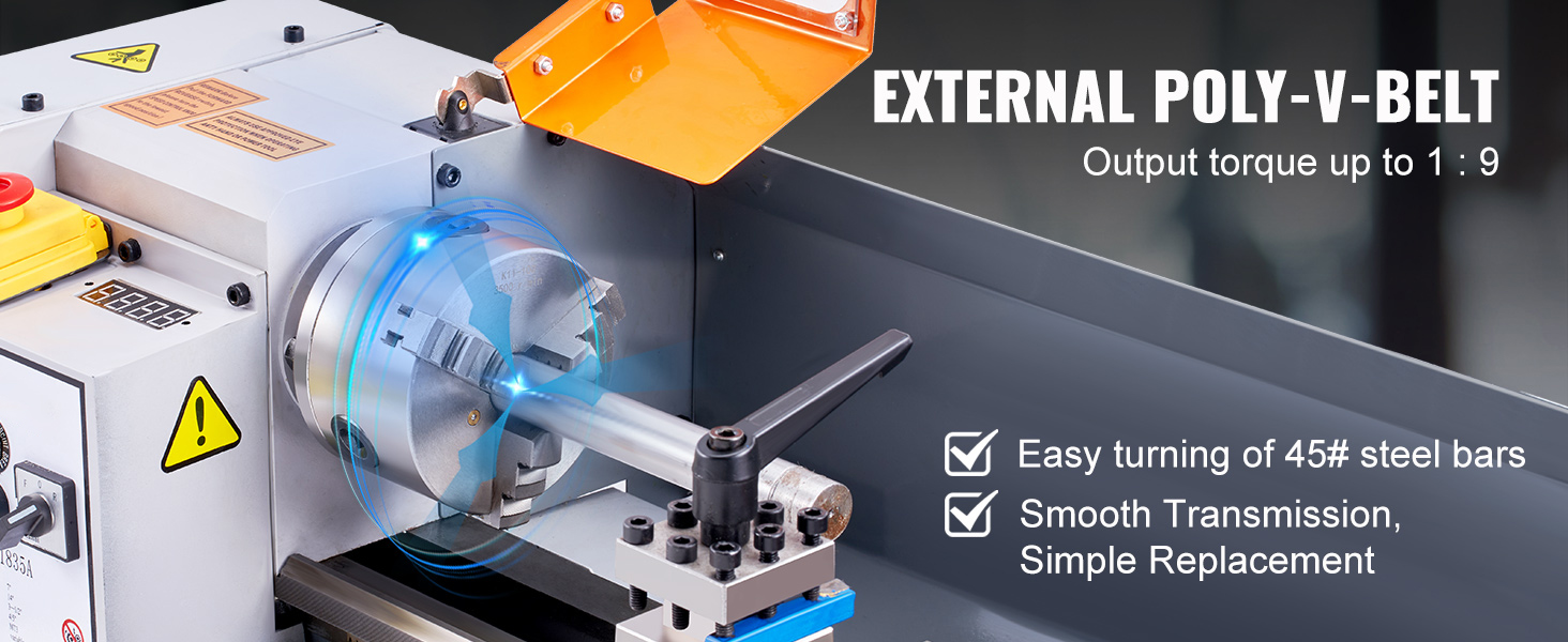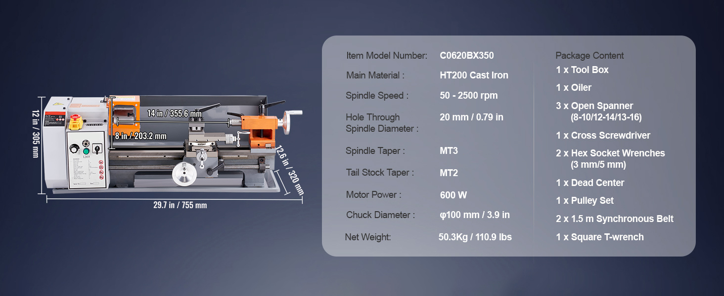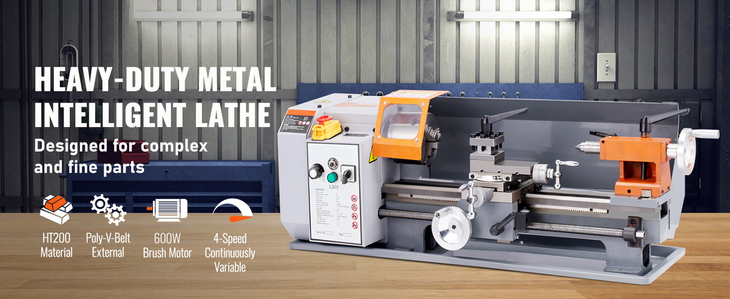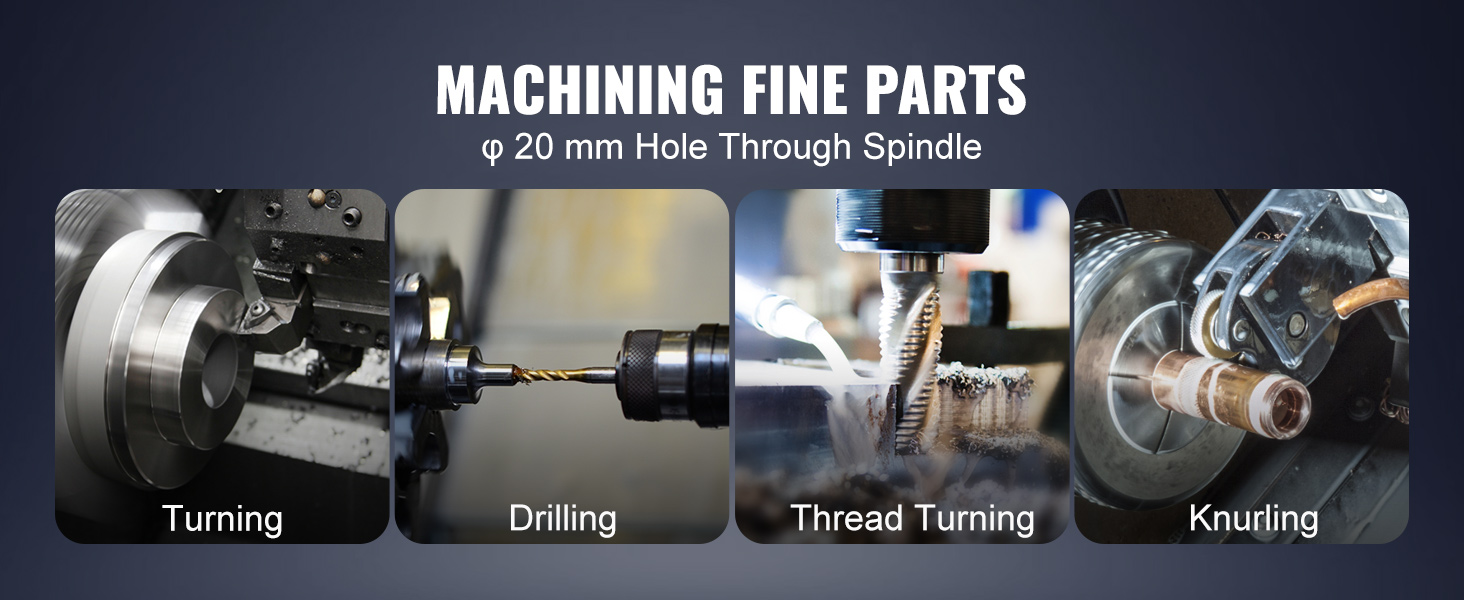 8'' x 14'' benchtop metal lathe features a powerful 600W motor and a robust HT200 cast iron body, ensuring durability and sturdiness. With a 20 mm / 0.79" hole through spindle, it accommodates various parts and threading tasks, allowing the processing of stainless steel, iron, wood, etc.