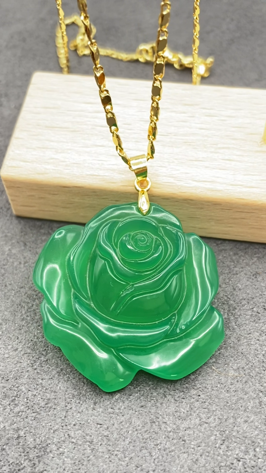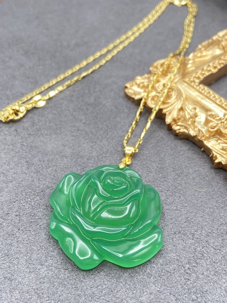 Jade Rose Flower Pendant Charm Necklace W/ 18K Gold Plated Chain Handmade Carved