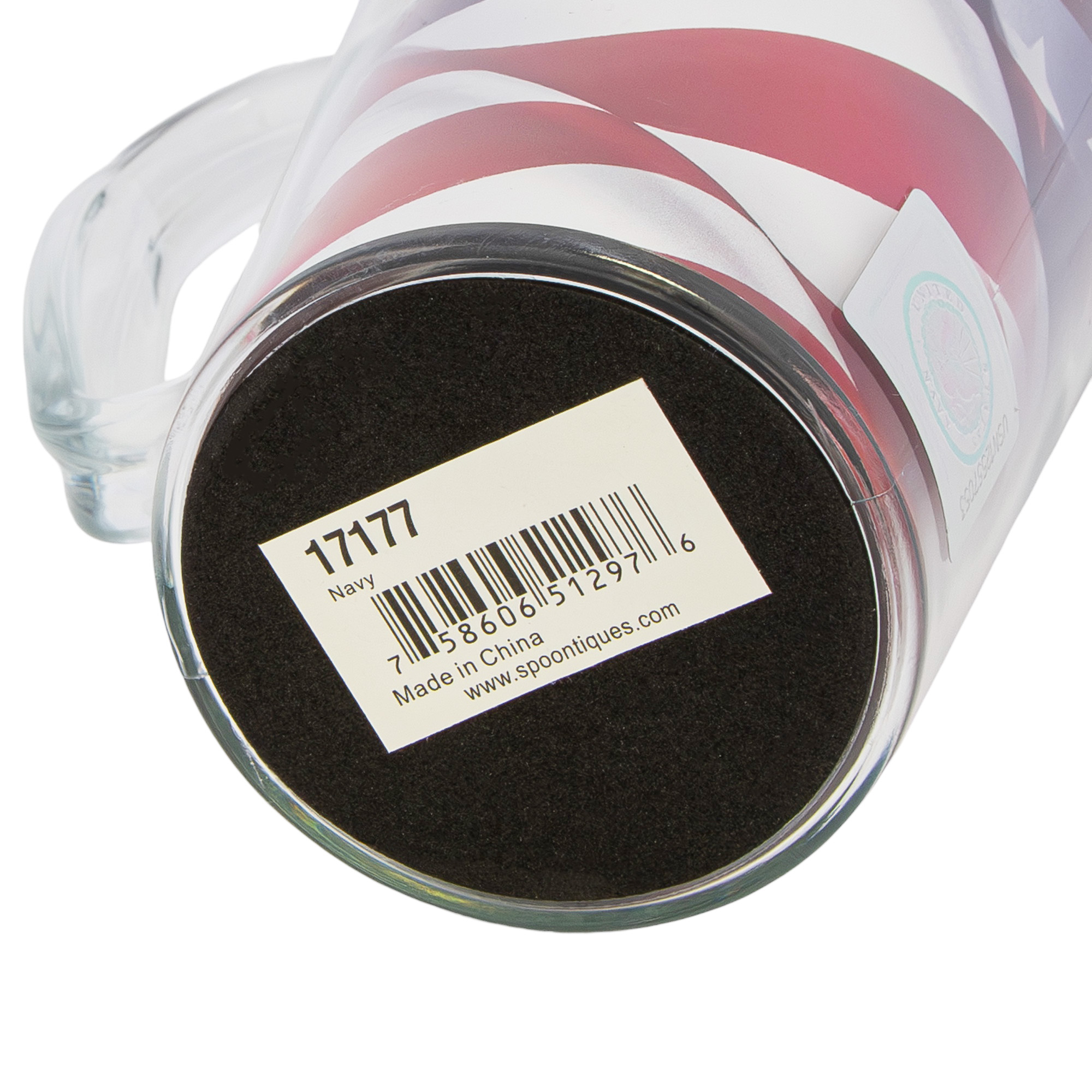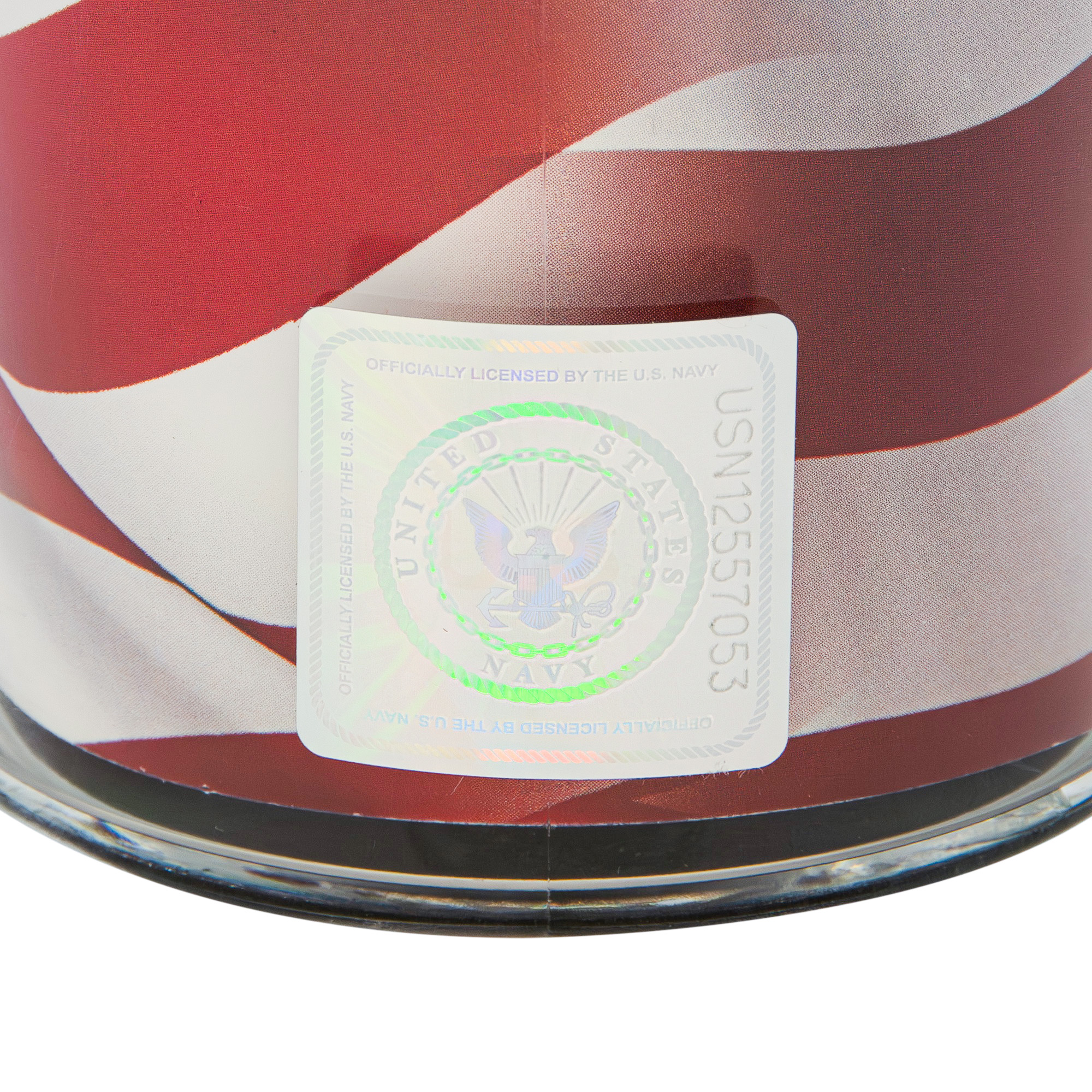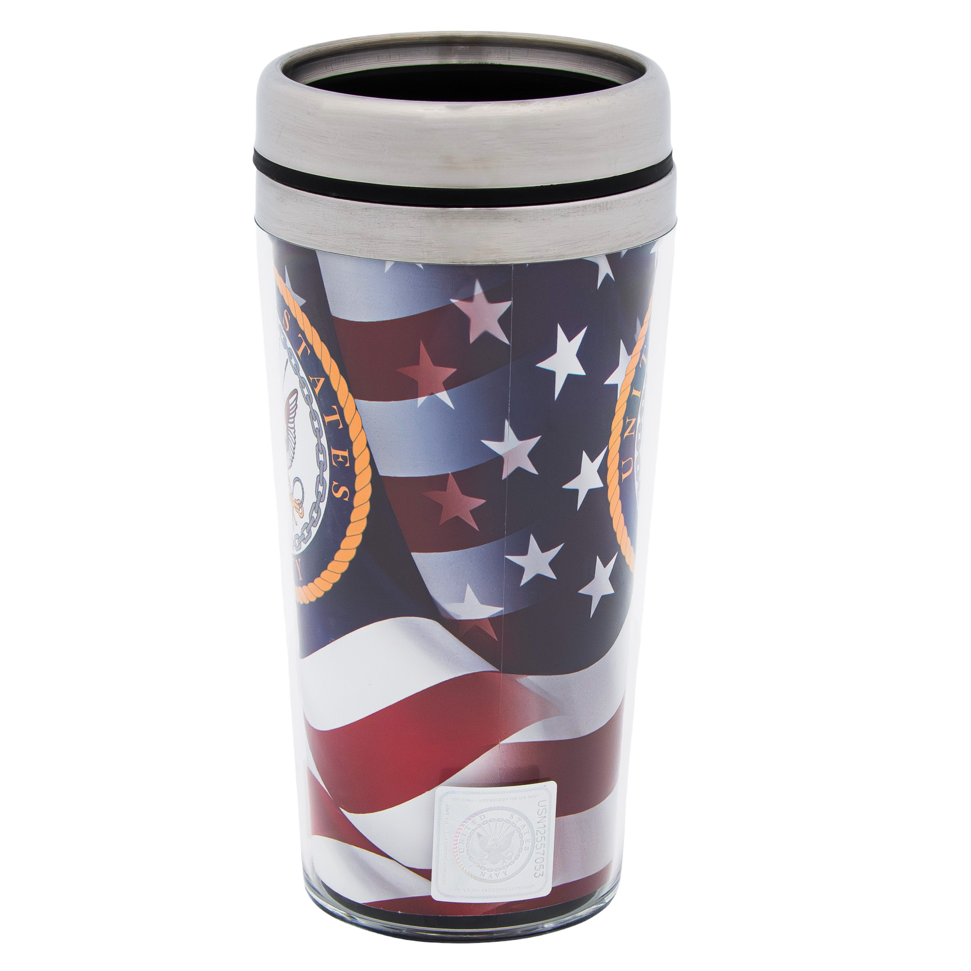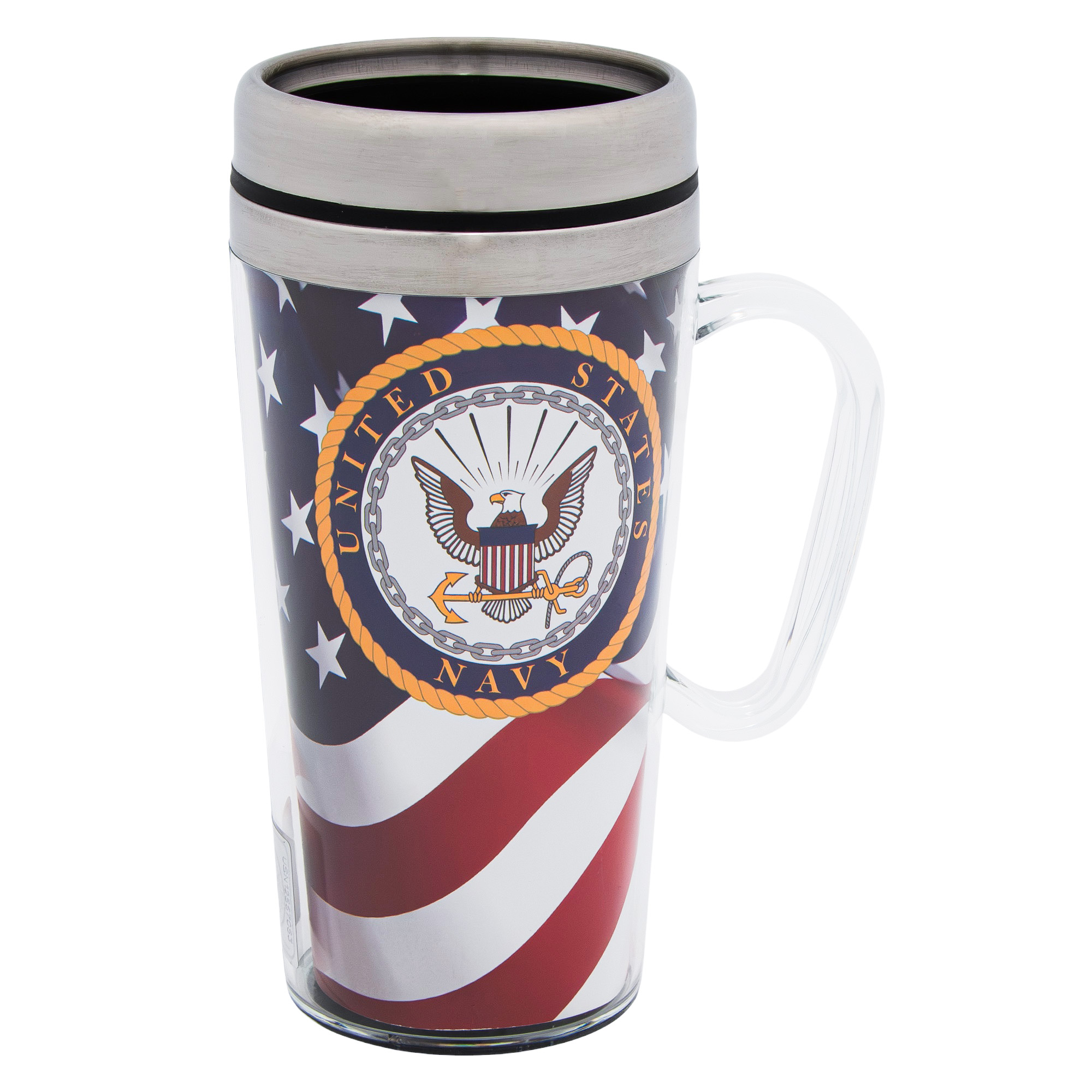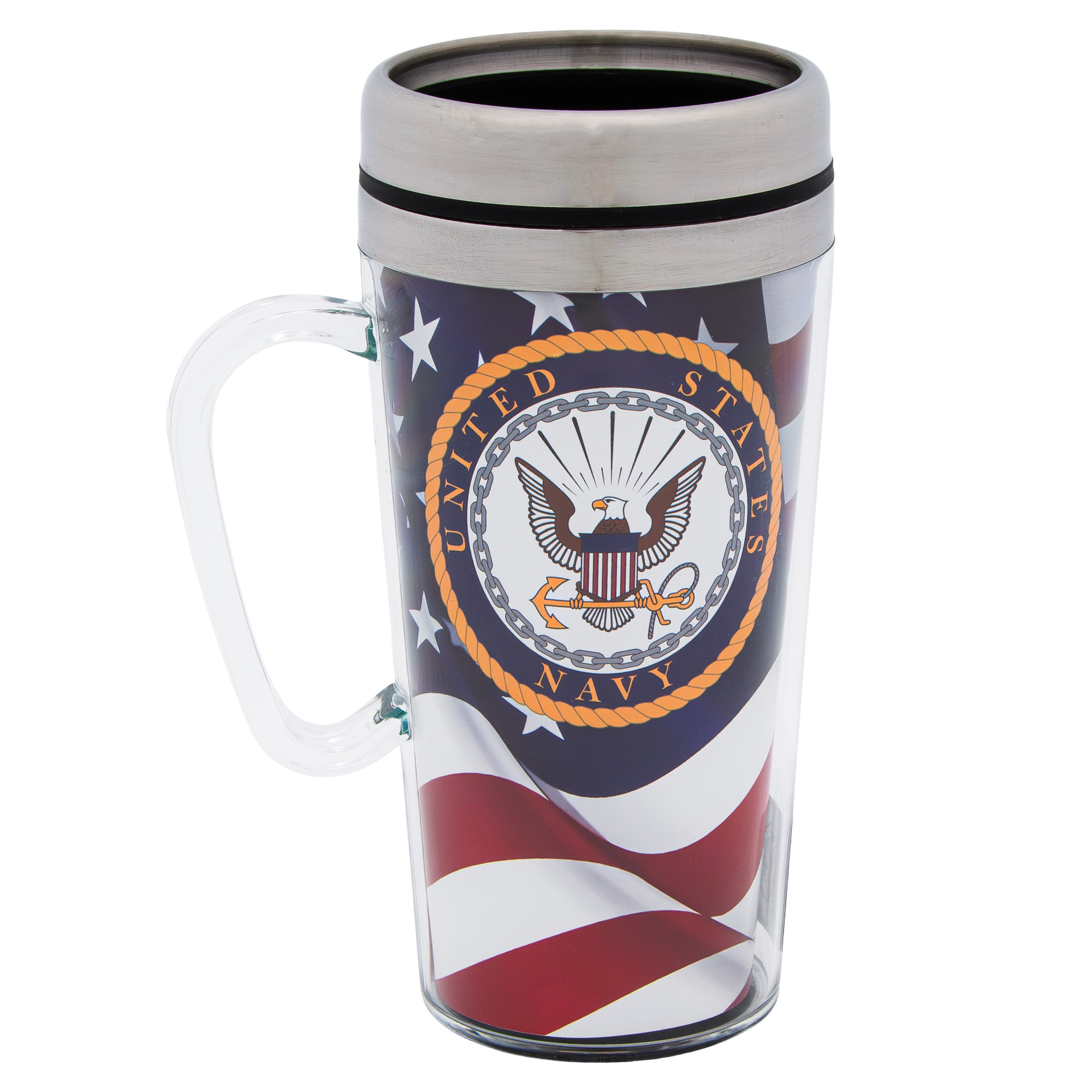 This 14-ounce travel mug features a patriotic American flag design with the US Navy logo, making it ideal for fans and service members alike. Its stainless-steel interior ensures durability and temperature retention, while the acrylic exterior adds a stylish touch. Equipped with a handle for easy carrying, this mug is perfect for on-the-go use, though it should be hand washed only to preserve its design and finish. Not safe for the dishwasher or microwave. Dimensions 7" tall x 3" diameter top (2.5" diam, bottom)