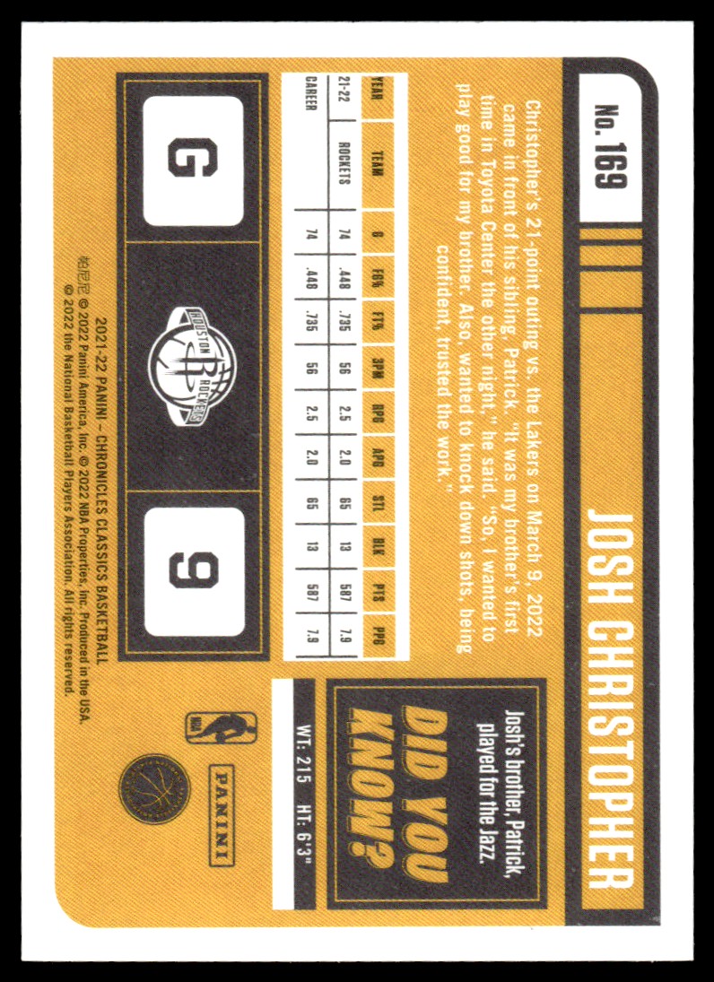 | 2021-22 Panini Chronicles Classics Josh Christopher Rookie #169 |
