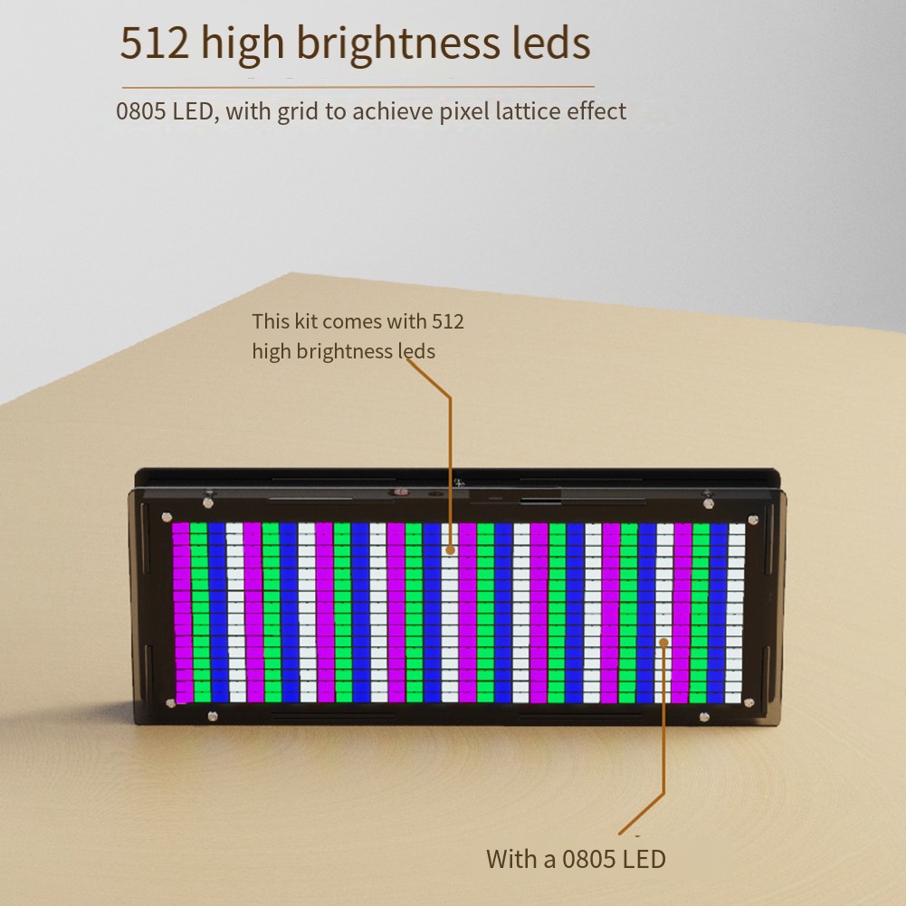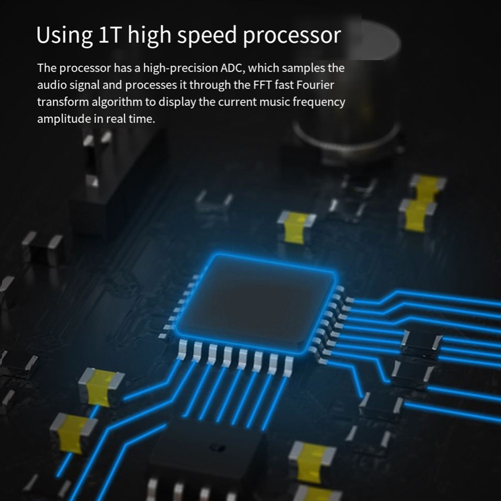 Musik-Spektrumanalyser mit einem hochleistungsfähigen Prozessor 1T mit hoher Genauigkeit ADC. Das Audiosignal wird durch das FFT-Fast-Fourier-Transmationsalgorithmus geprüft und verarbeitet um die Amplitude der aktuellen Musikfrequenz in Echtzeit darzustellen.