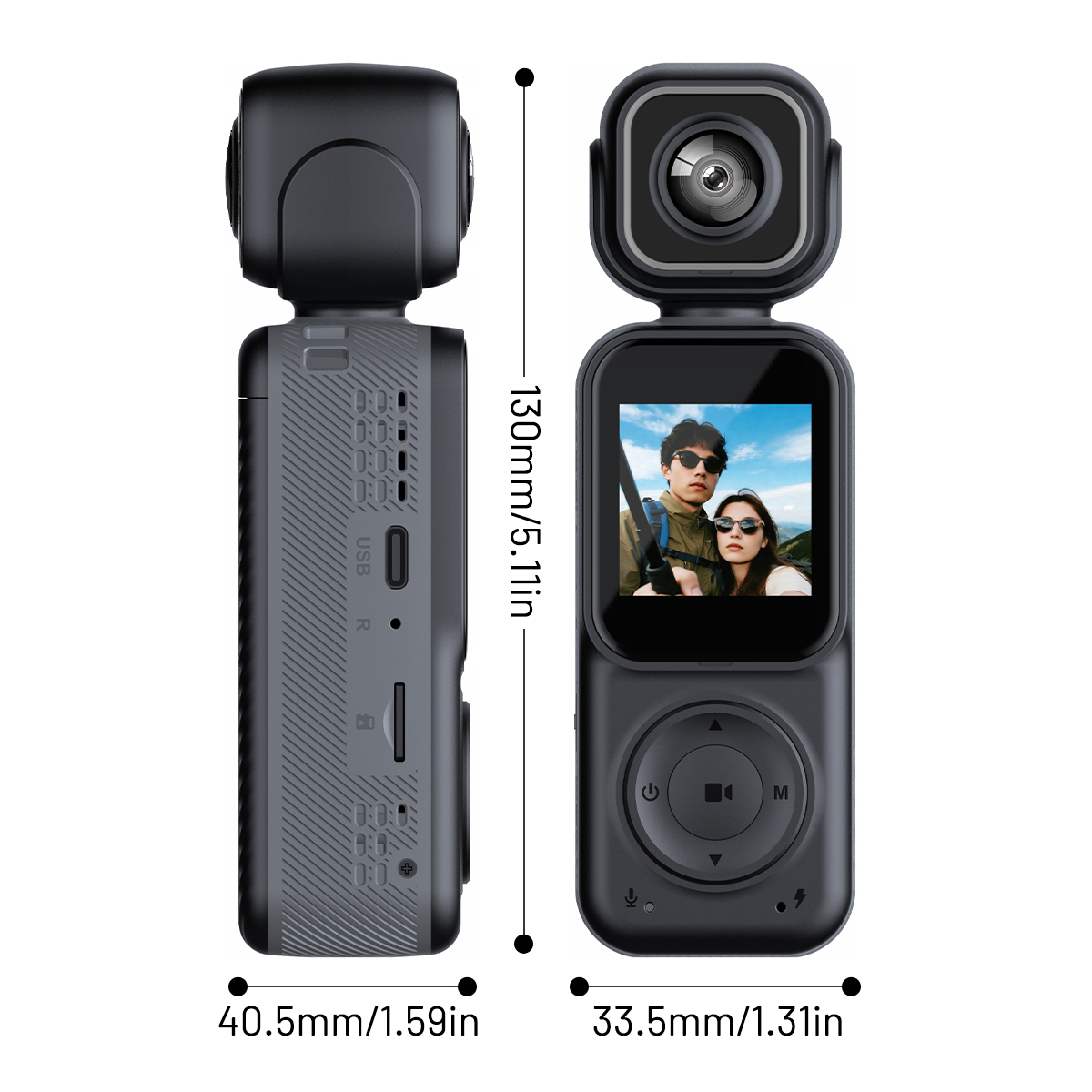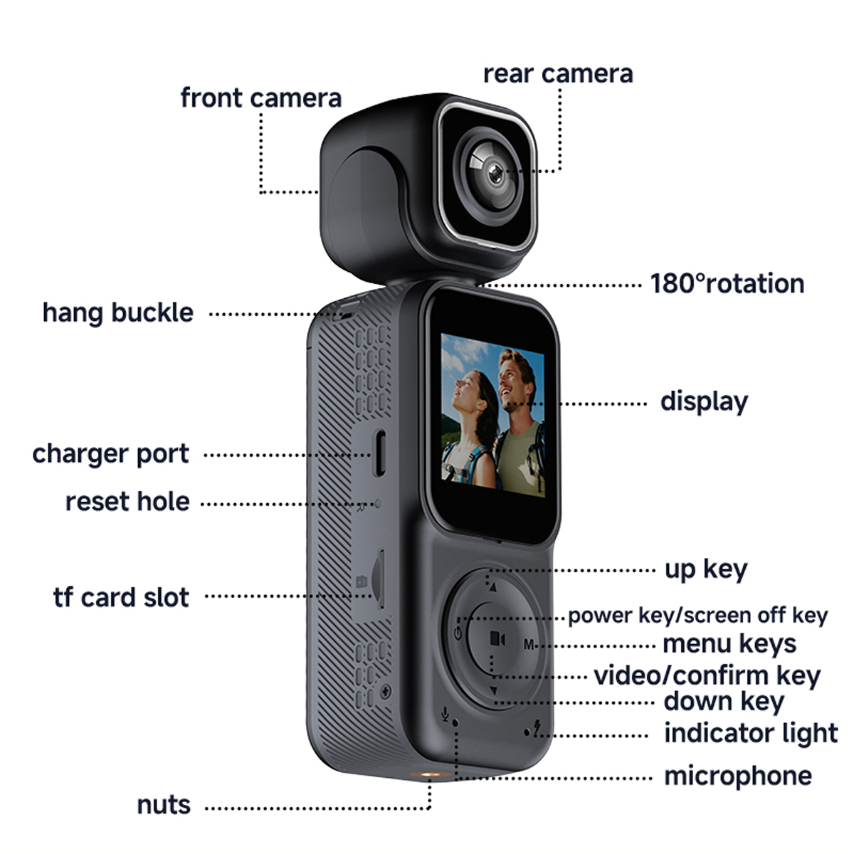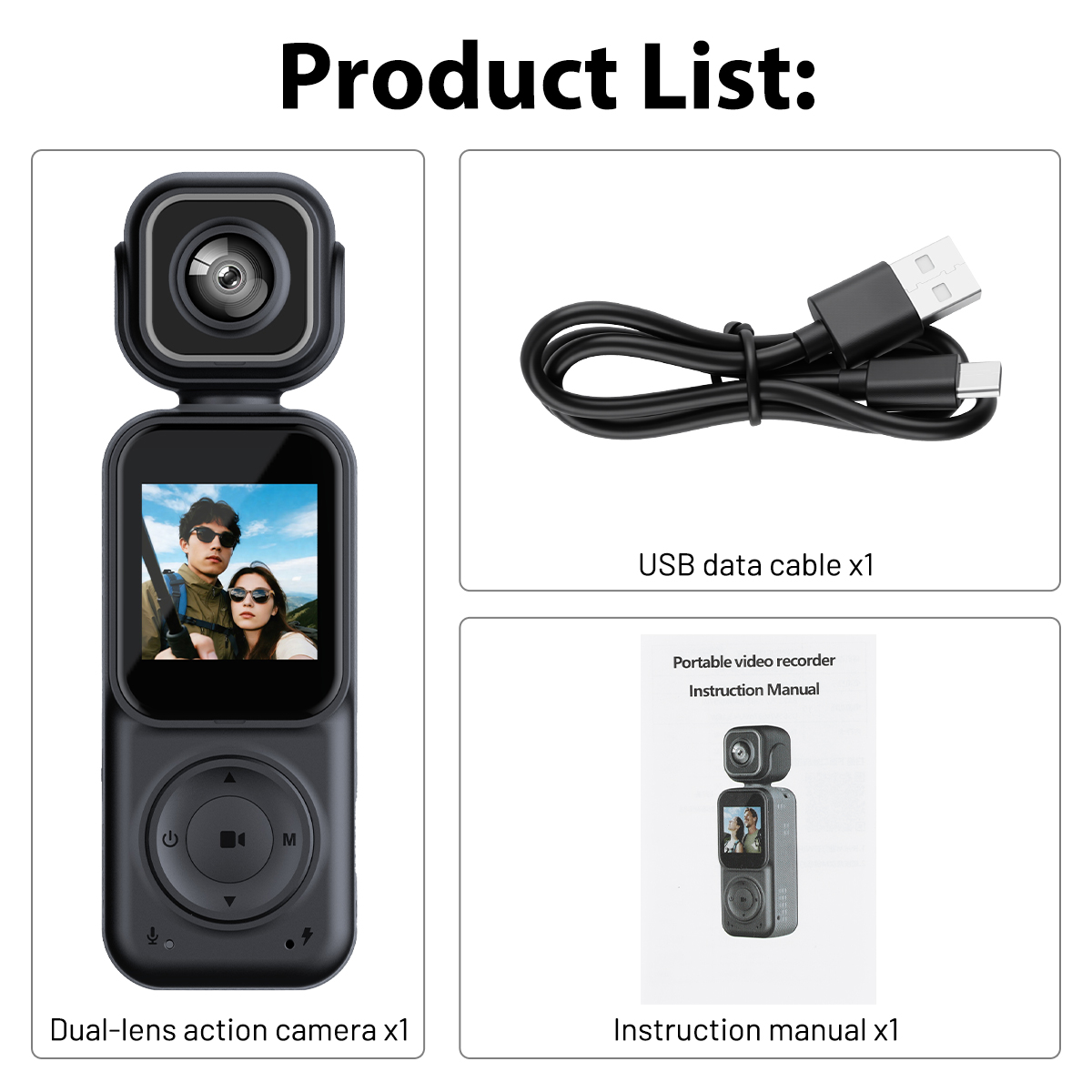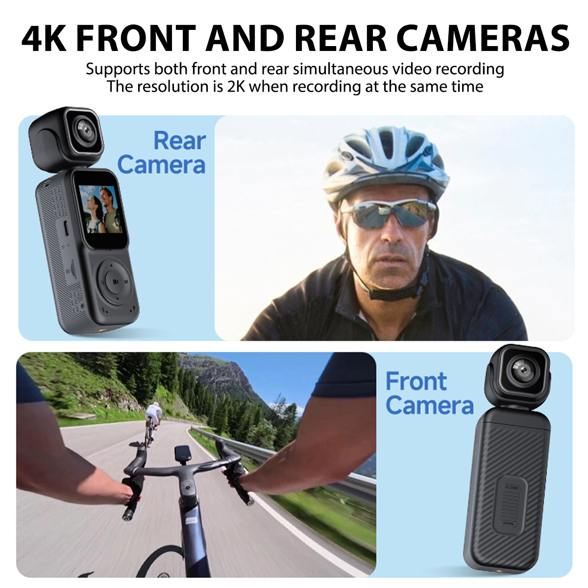 1. Dual-lens simultaneous shooting: The front and rear dual-lens can simultaneously record the beautiful moments of outdoor sports and family life in all directions. You can also switch between single front lens and single rear lens shooting.