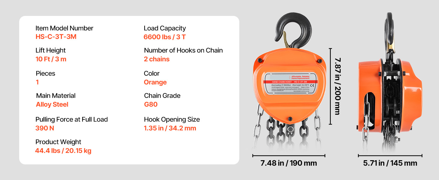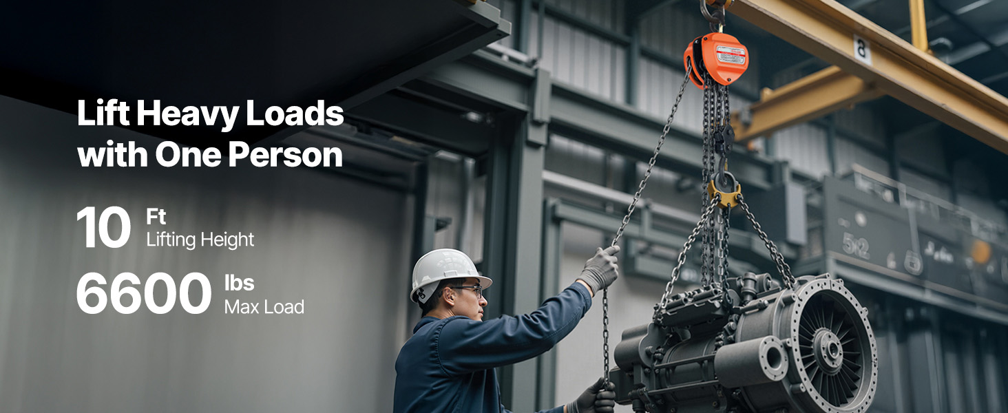 6600 lbs / 2200 lbs / 4400 lbs / 1100 lbs Load Capacity: This manual chain hoist is designed to tackle demanding lifting jobs, with a maximum capacity of 6600 lbs / 2200 lbs / 4400 lbs / 1100 lbs and a lifting range of up to 10Ft / 20Ft. Perfect for use in garages, construction areas, and storage facilities.