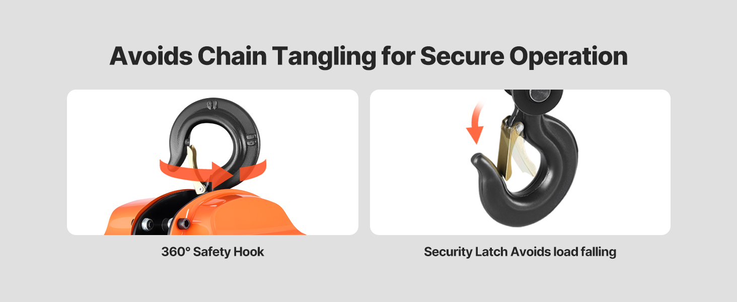 360° Swiveling Hooks: The hooks are designed to swivel a full 360°, allowing for convenient and adaptable positioning. A built-in safety latch ensures reliable operation, while the adjustable lifting angle prevents chain tangling, promoting smooth and efficient work.
