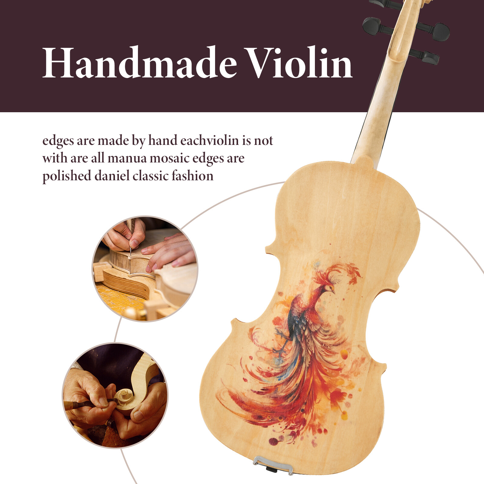 - Please kindly know that the back of neck is not painted due to the design. And the color and growth ring lines of each violin will be slightly different as they are hand crafted.